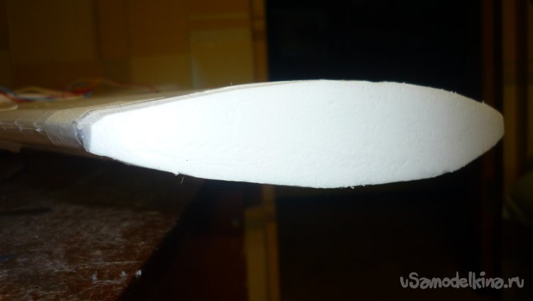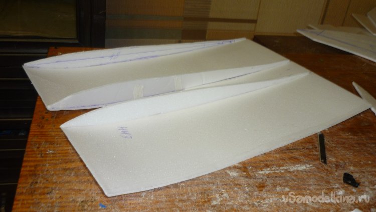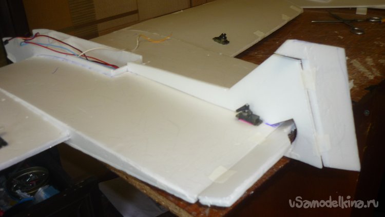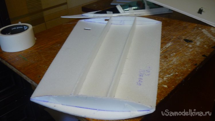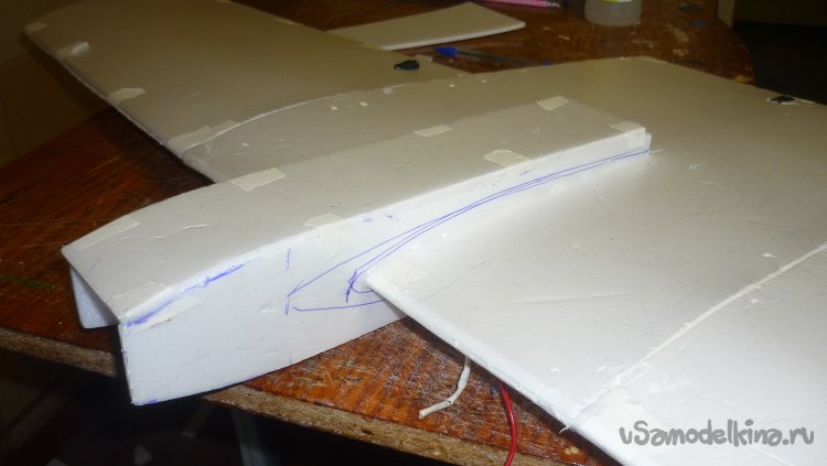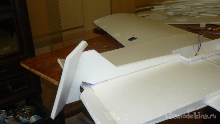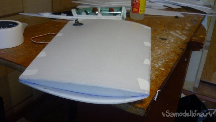 Склеиваю две заготовки, отрезаю переднюю кромку под углом 45 градусов и навешиваю рульвысоты и руль направления на бумажный, малярный скотч.