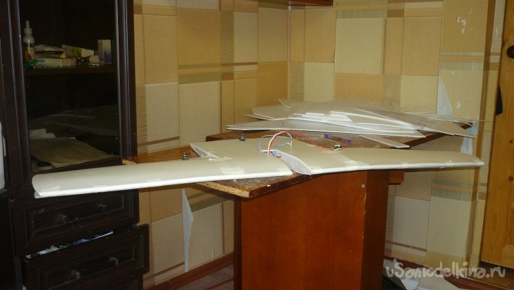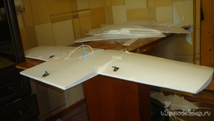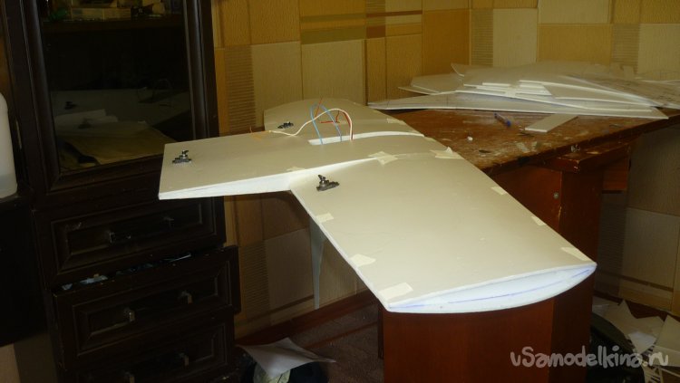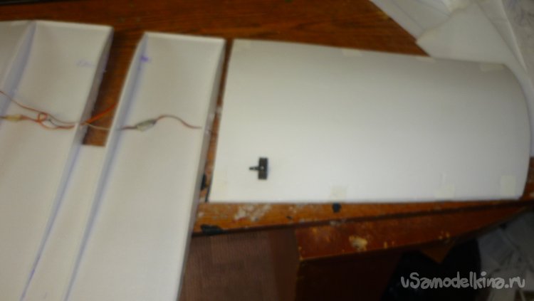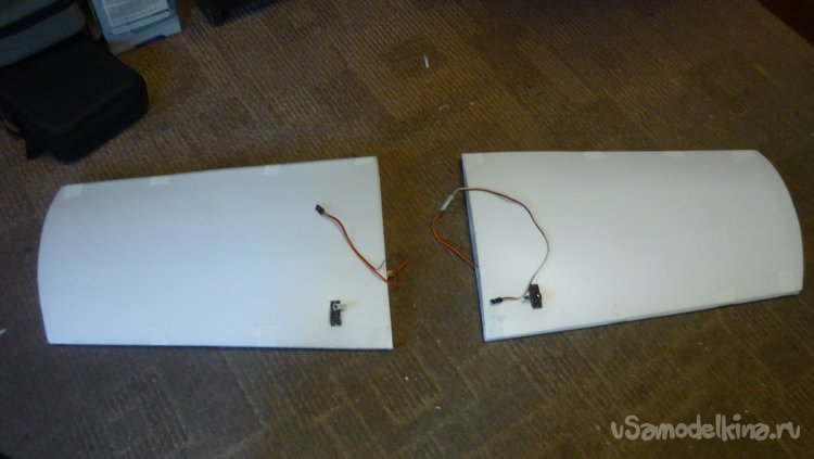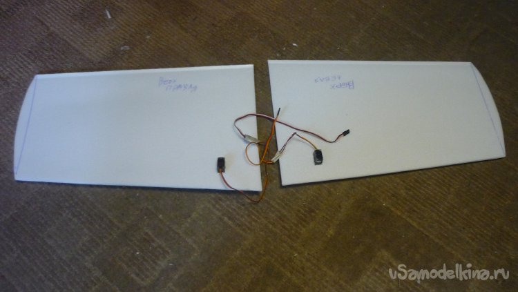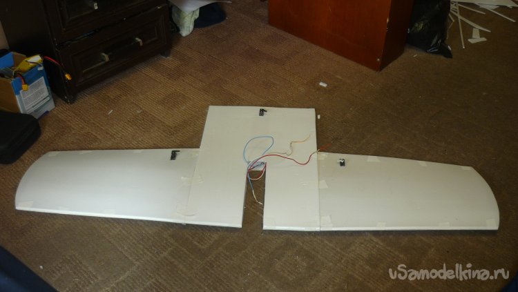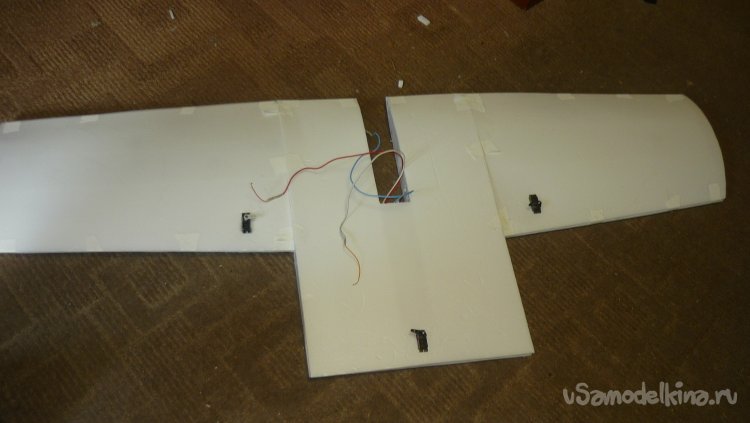 Смонтировал сервомашинки управления элеронами, подготовил провода к стыковке консолей с центропланом.