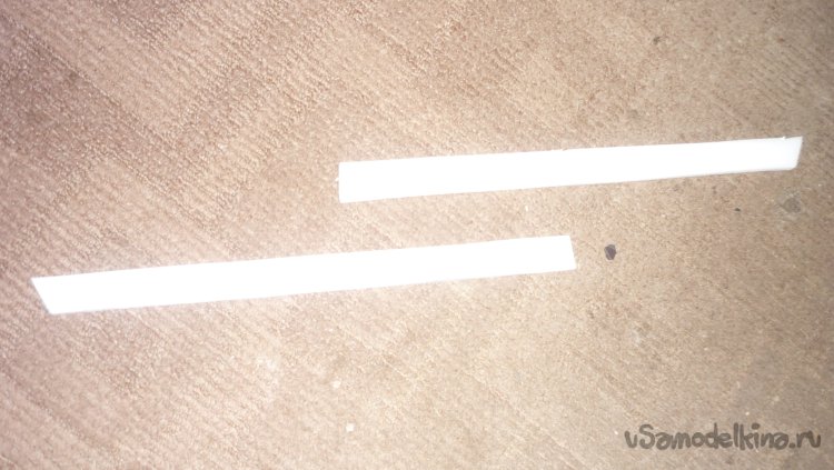 Склеиваю заготовки элеронов в два слоя, отрезаю переднюю кромку под углом 45 градусов и навешиваю на малярный, бумажный скотч.
