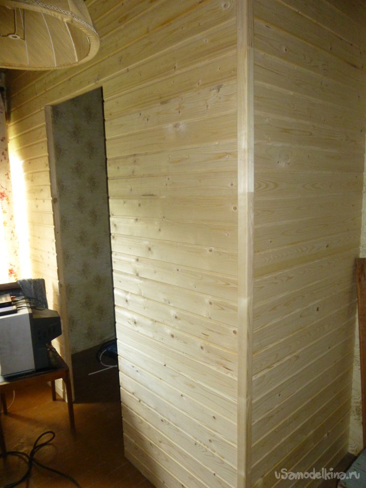 Снаружи начал обшивать вагонкой. Вагонку крепил на финишные гвоздики.