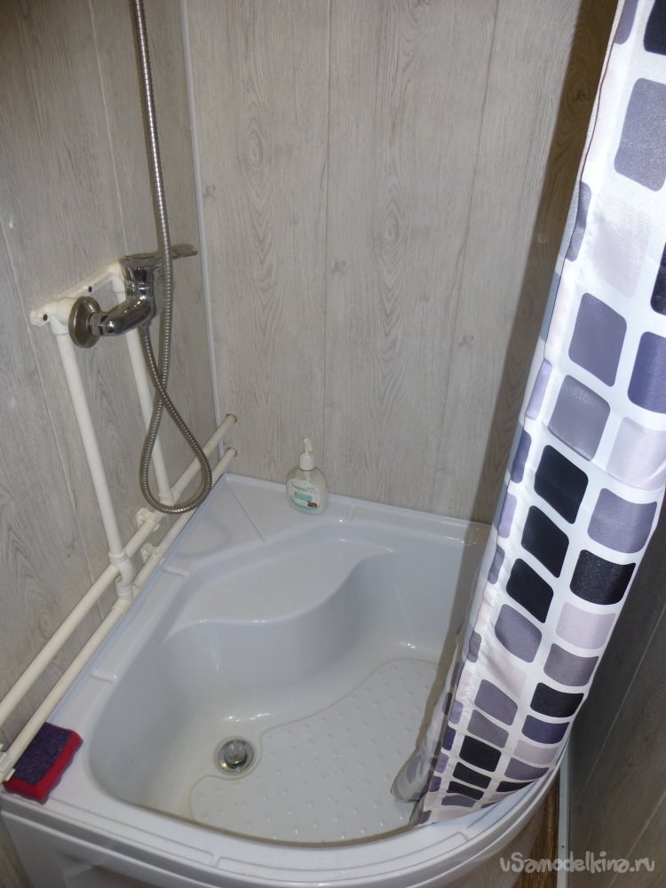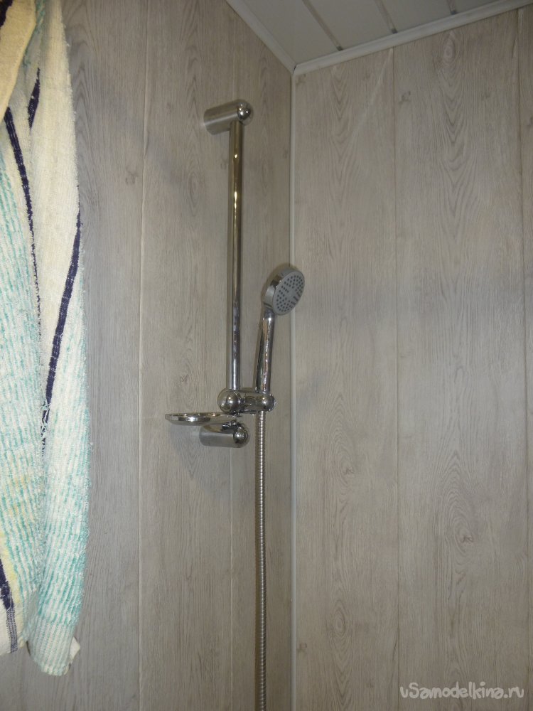 С правой стороны от дверного проёма установлен душевой поддон и смеситель для душа, который висит на штанге.