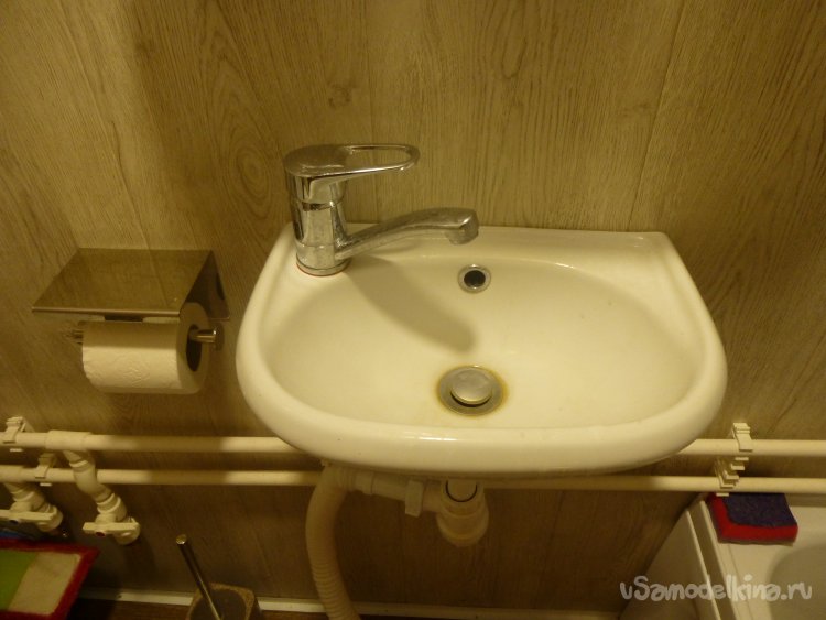 И, наконец, раковина в санузле, которая стоит между унитазом и душевым поддоном.