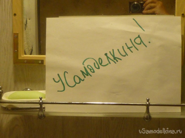 Над раковиной закреплена стеклянная полочка и самоделашное зеркало. Просто сосед когда-то отдал само зеркало, а я уже сделал собственно обрамление из бруска 20х20 мм, пропилив в нём паз на циркулярке.