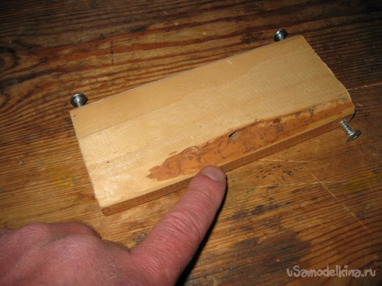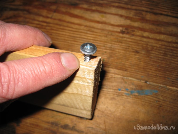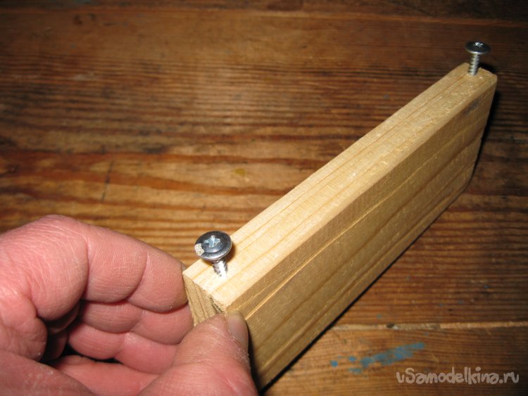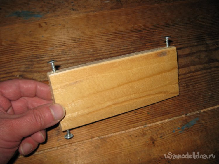 Этот отрезок дощечки я слегка обработал наждачной бумагой, а затем завернул в его боковые стороны по краям три шурупа с прессшайбой. С одной стороны дощечки получилось два шурупа, а с другой один.