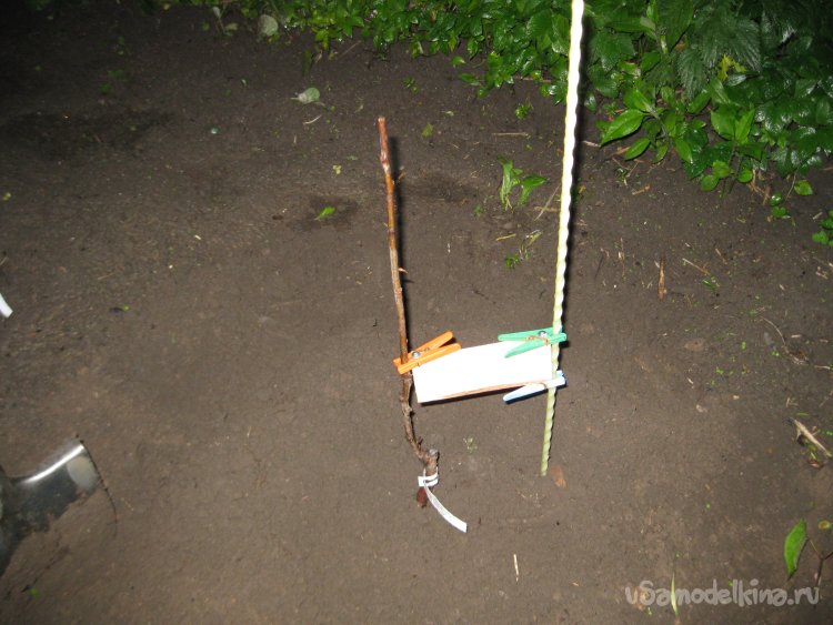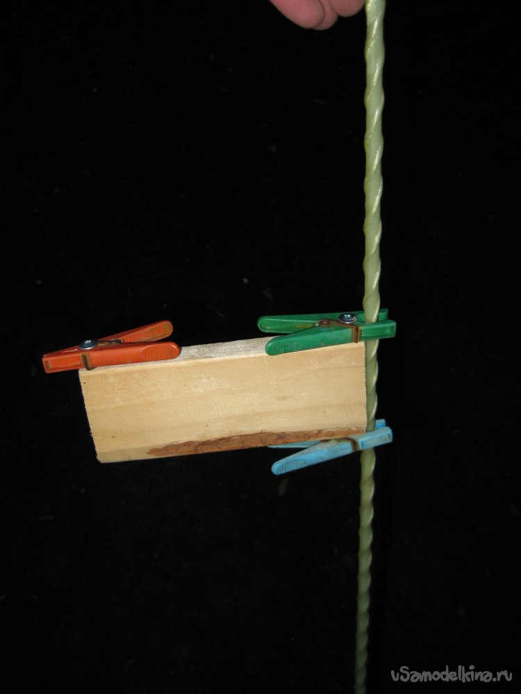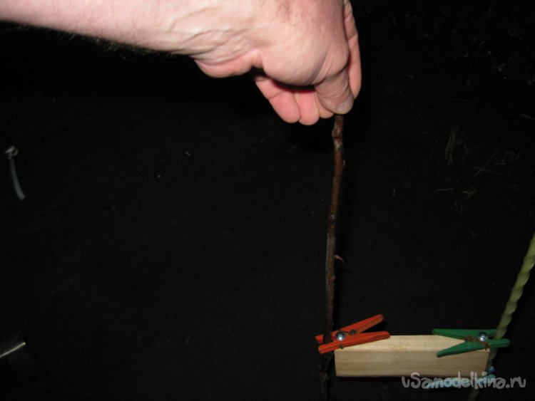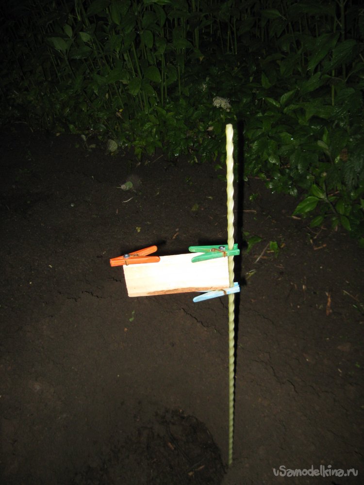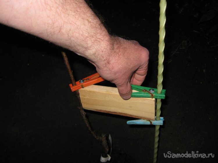 Для этого устанавливаем наше приспособление на колышек при помощи двух бельевых прищепок.