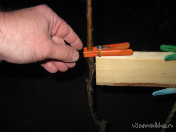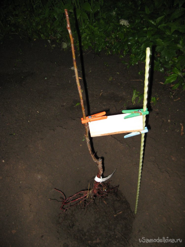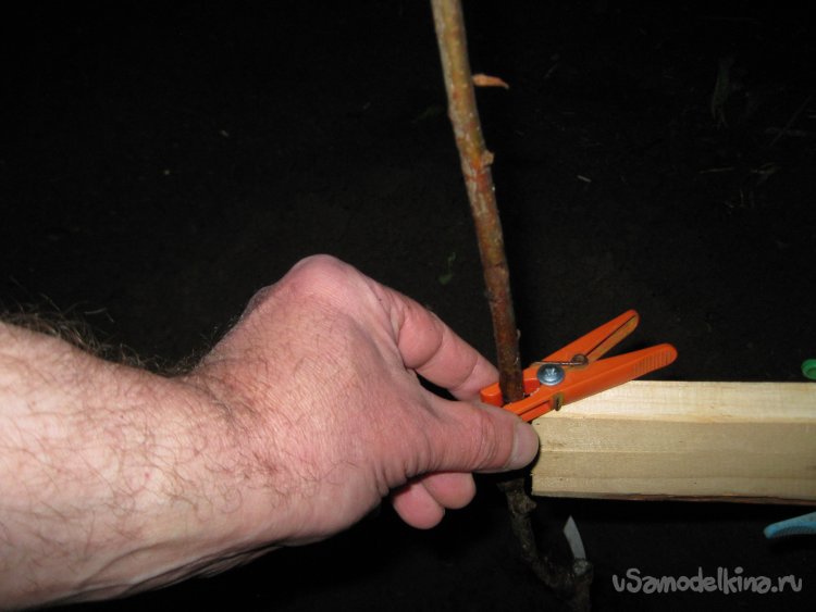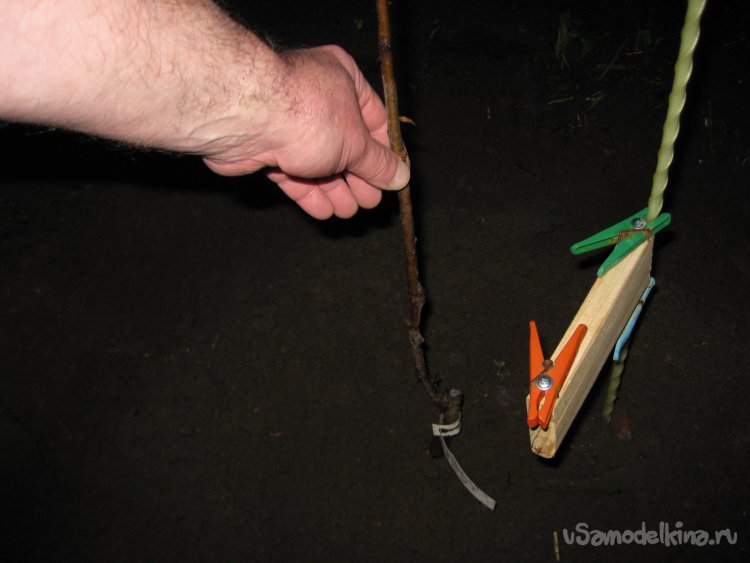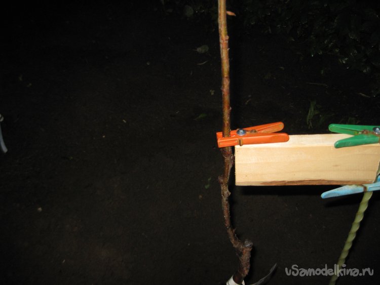 Ну, а теперь аккуратно, чтобы не повредить, зажимаем саженец в эту прищепку.