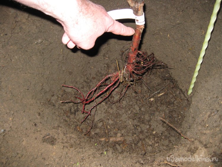 Теперь остается только слегка выровнять саженец по вертикали (хотя это можно будет сделать и потом), расправить его корни и можно приступать к засыпанию посадочной ямы.