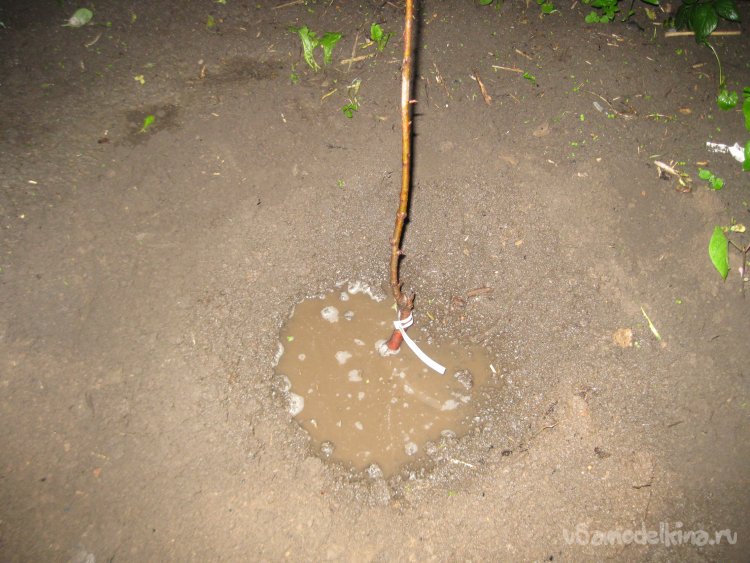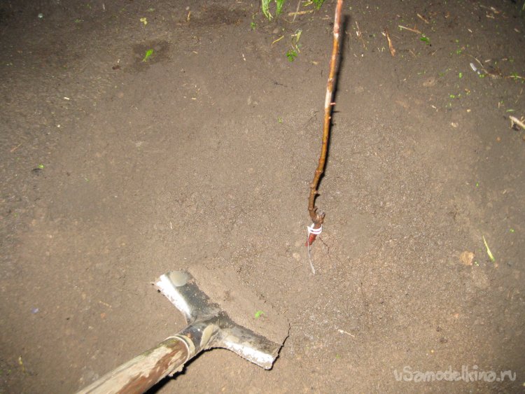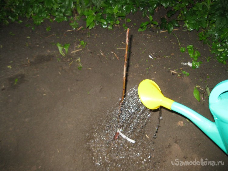 Этот колышек будет обозначать место посадки саженца, а также в будущем, когда саженец начнет расти, и на нем появятся листья, его можно будет подвязать к этому колышку.