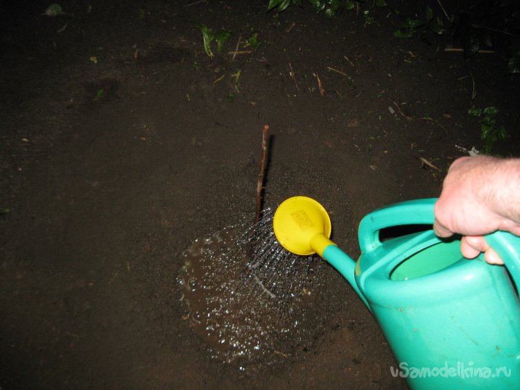 Затем втыкаем этот колышек в дно посадочной ямы, так чтобы он находился сбоку от нас, у самой стенки ямы.