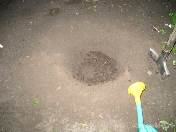 Сначала я приготовил все необходимое для посадки. Выкопал посадочную яму и заполнил ее примерно на одну треть смесью верховой земли и перегноя. Приготовил лейку с водой.
