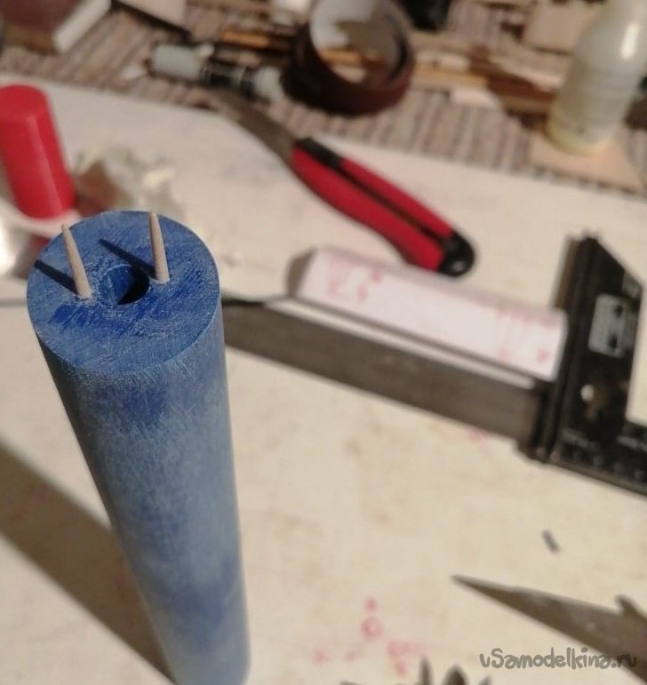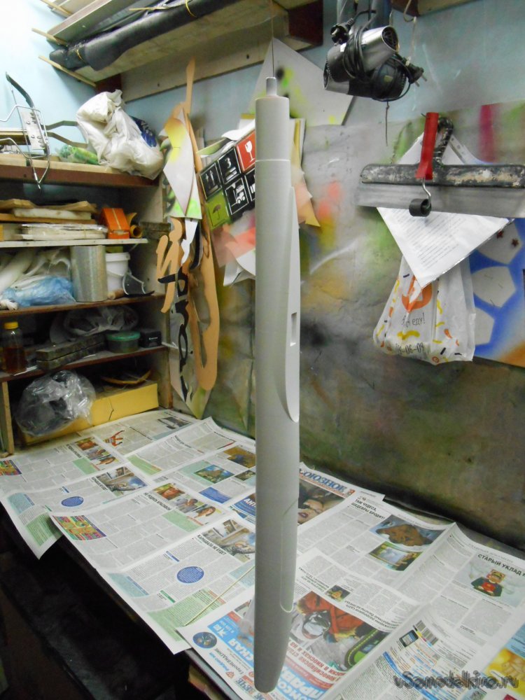 Основные размеры определены и спроектированы на ПК. После разбиты на фрагменты, напечатаны на принтере. Весь бутерброд соединен на металлической шпильке, склеен. Отшлифован, загрунтован, окрашен двухкомпонентной автомобильной эмалью.