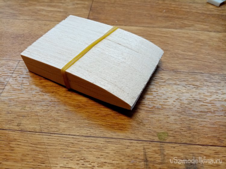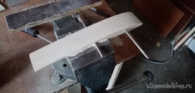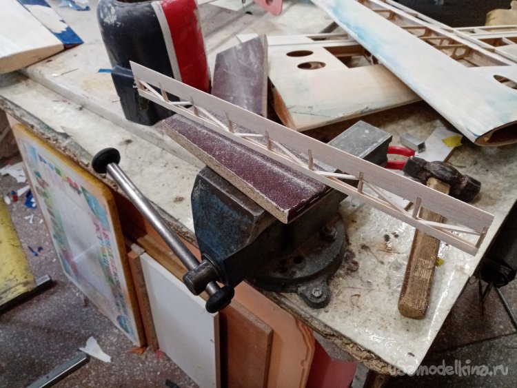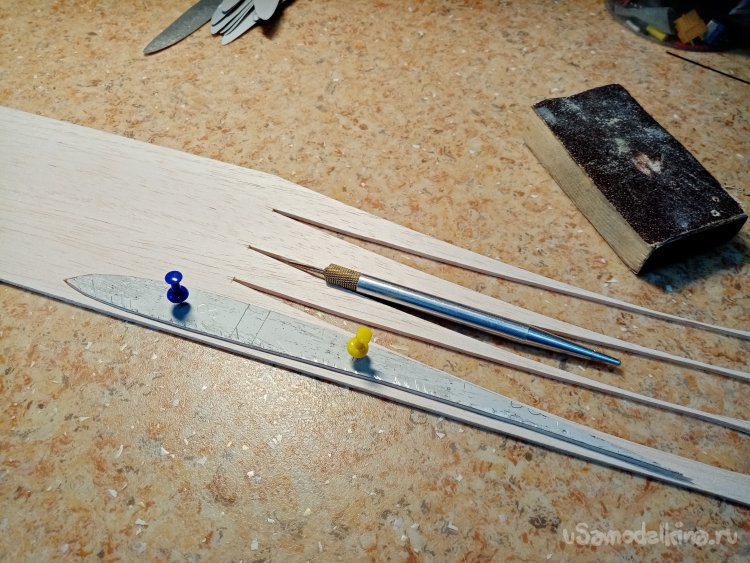 На самодельном утюжке со шкуркой придаю некоторый угол бальзовой пластине на конце элерона.