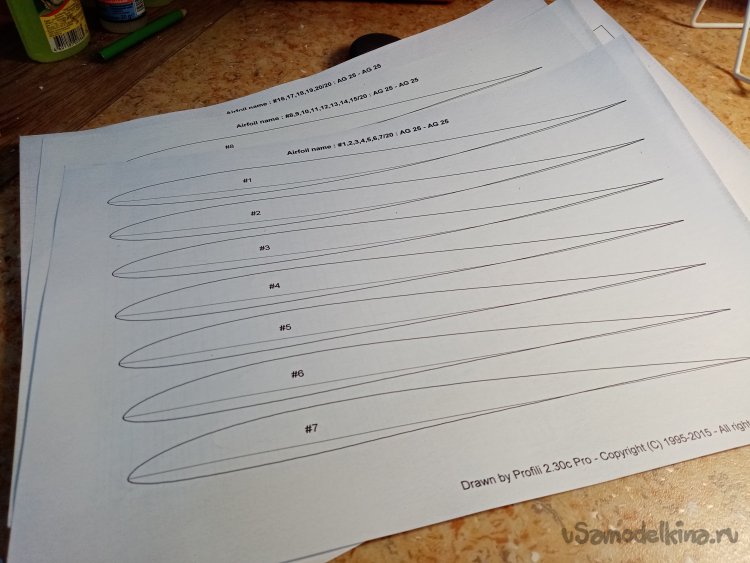 В программе «профили» нахожу нужный вариант нервюр и распечатываю. Поскольку крыло самая важная часть , с него и начинаю постройку.