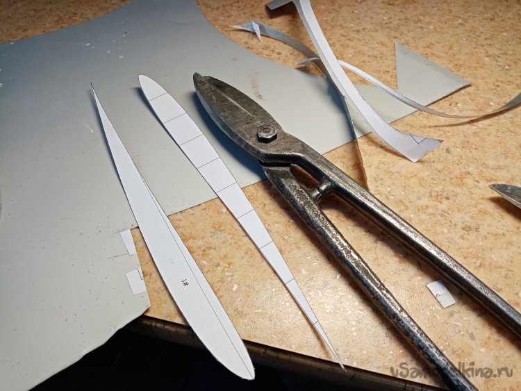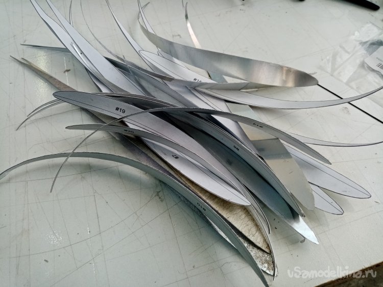 Бумажные нервюры наклеиваю на тонкий алюминий от офсетных пластин. Вырезаю по контуру ножницами по металлу. Но есть тонкость. После резки, как не старался, железки изогнулись в произвольном направлении.