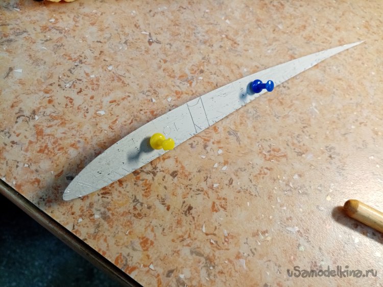 Очень аккуратно выпрямляю шаблоны нервюр при помощи деревянной палочки. Пришлось еще раз распечатать картинку и при выправлении сверяться с оригиналом. Хвостики тонкие и есть вероятность не попасть в размер. Операция долгая и трудная.