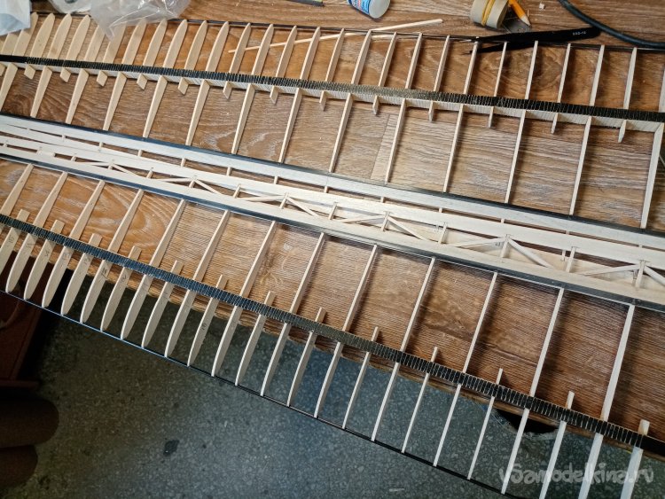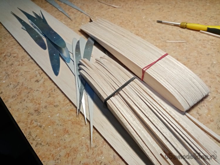 Наконец все шаблоны нервюр выпрямлены, сопоставлены с оригинальным чертежом. В каждом шаблоне просверлены отверстия для канцелярских булавок. Очень аккуратно и осторожно режу из бальзы нервюры по шаблонам.