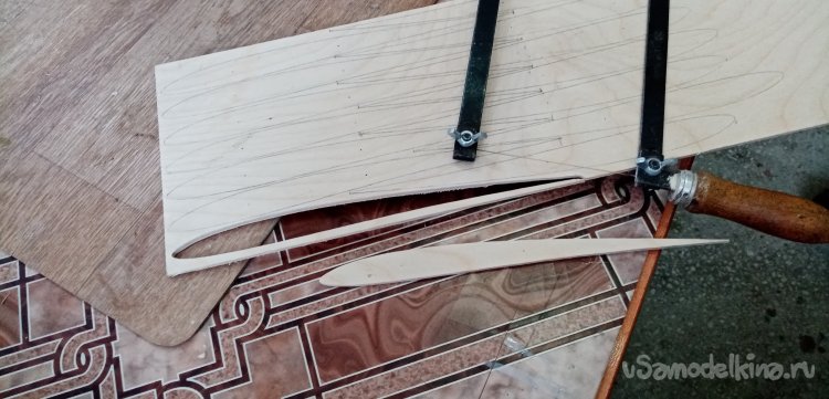 Пачки нервюр уложены по порядку и пронумерованы. Нужно выпилить из 3 мм шлифованной фанеры законцовки для центроплана и ушей крыльев. В бой вступает лобзик. Все вручную.