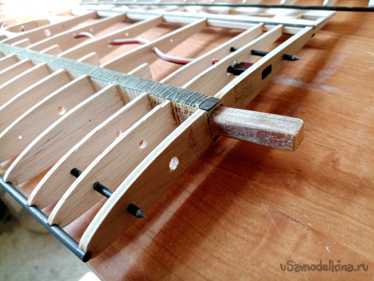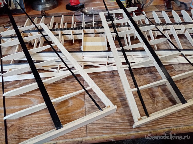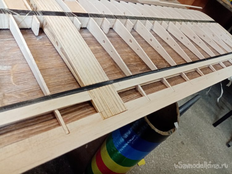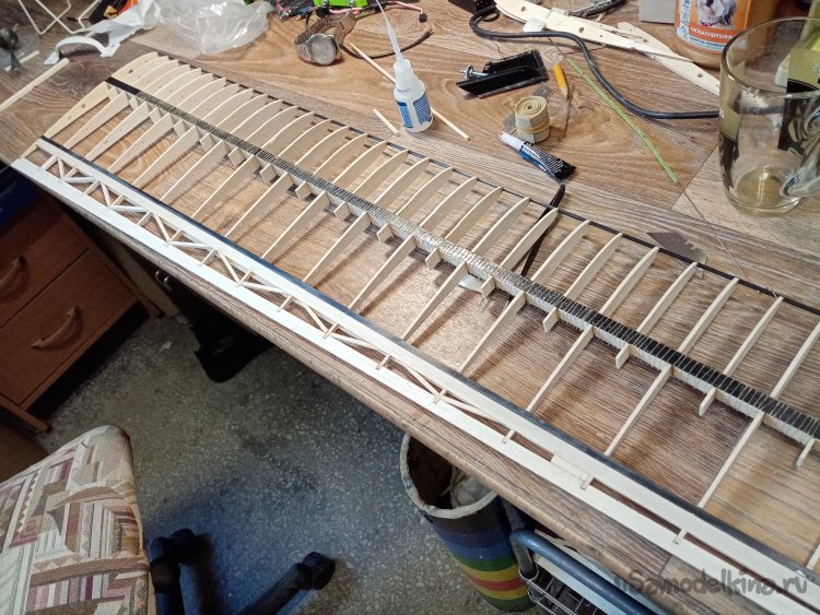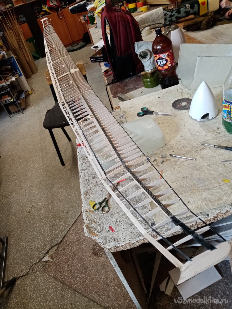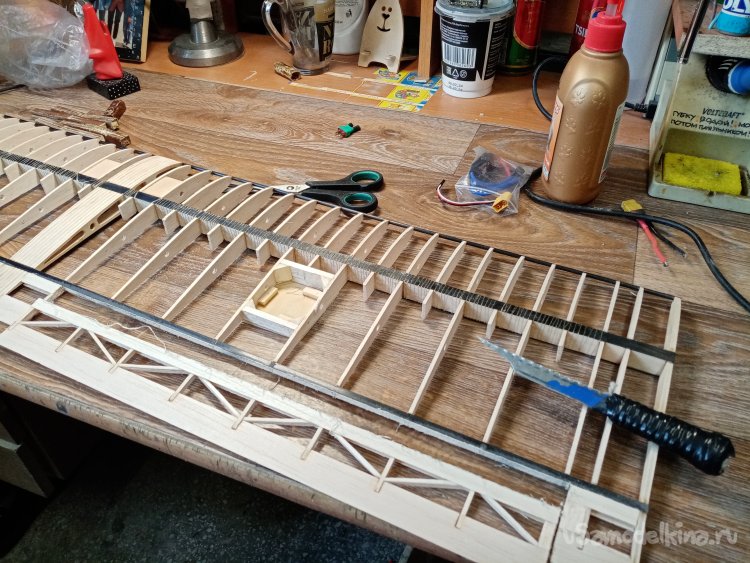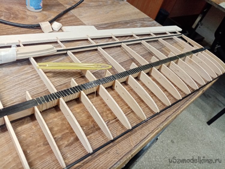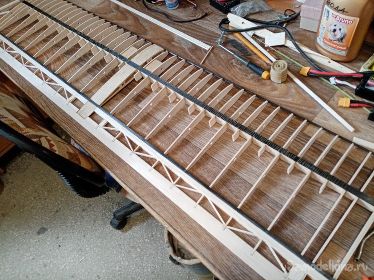 Центральный лонжерон укреплен рейками из карбона 10х1 мм. После сборки усилен обмоткой карбоновой нитью. Самая трудная и долгая операция. Пришлось вспоминать рыбалку. Плетение сетей челноком. В центральной части крыла усиление склеенных эпоксидной смолой фанерных нервюр. Максимально облегченных вырезами. Это самая нагруженная часть крыла. Через которое оно будет крепиться к фюзеляжу. Задняя кромка в районе элеронов также укреплена полоской карбона 3х05 мм.