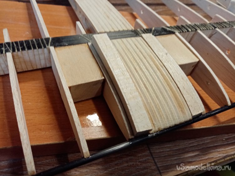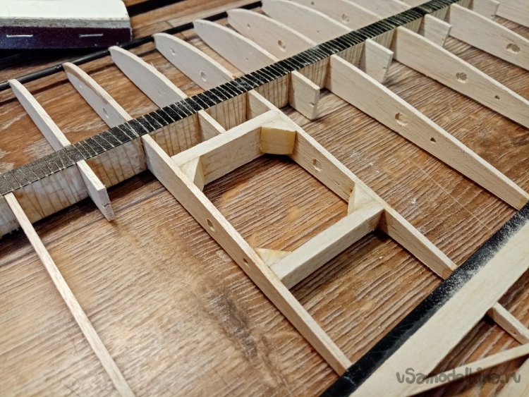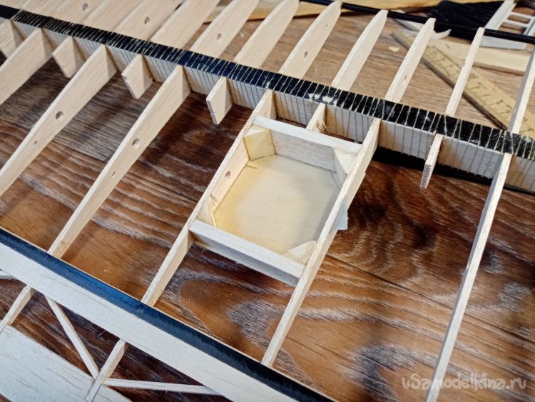 Нужно еще немного поработать с крылом. Вернее с центропланом. Немного усиливаю центральную часть. Подрезаю подвижные элементы управления и приклеиваю на торец заглушки. Формирую усиления в носовой части. Заполняю пространство легкой бальзой. Устанавливаю бобышки из липы для крепления к фюзеляжу. Элементов крепления будет три.
