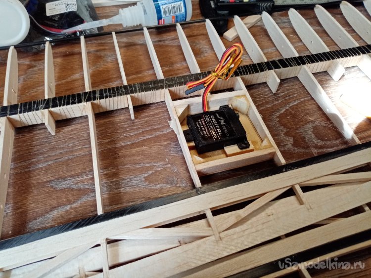 На элеронах установил закладки из бальзы, в этом месте будут установлены кабанчики.