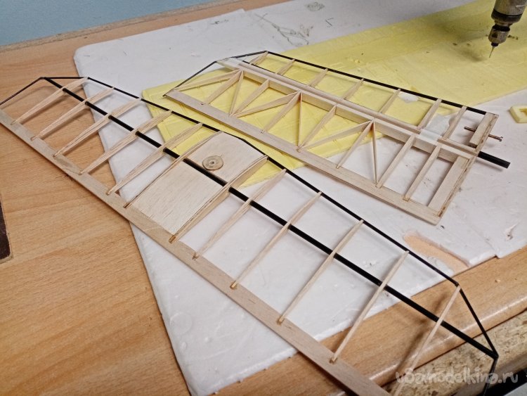 Нужно слегка отдохнуть от процесса подготовки заготовок крыла. Перехожу к рулю высоты. В данной модели будет цельноповоротный вариант. Основные силовые элементы изготовил из кончиков удочек различного сечения. Центральный из карбона в 5 мм. Переднюю кромку из 3мм. Нервюры их легкой бальзы окантованные карбоном. Конструкция собрана на циакрине.