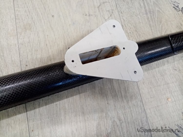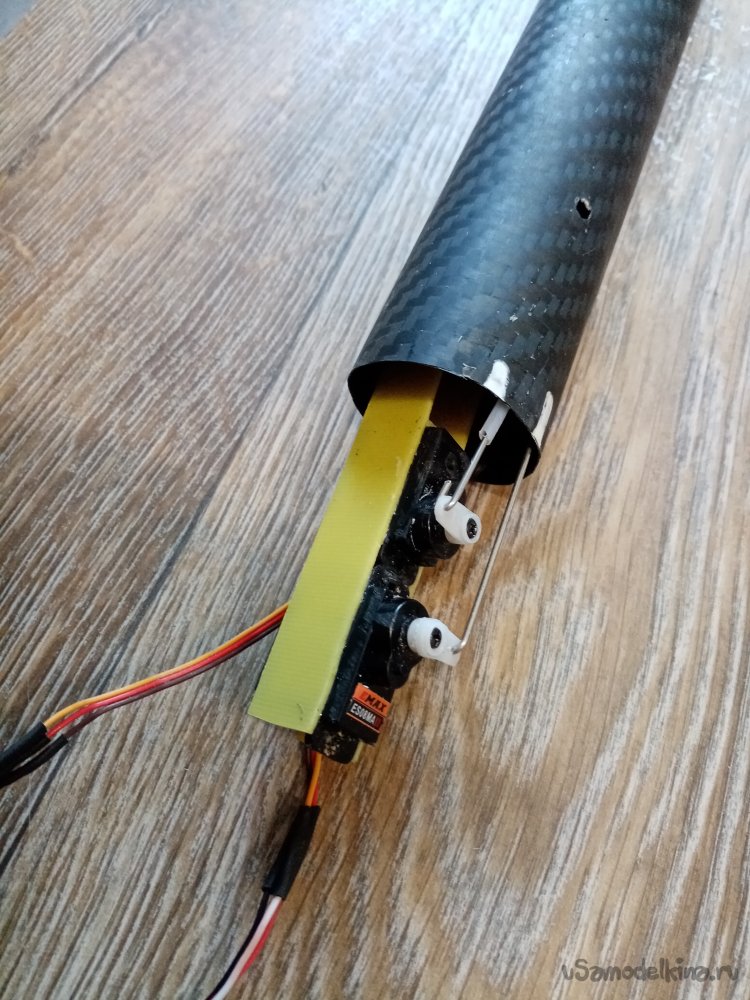 На специальной площадке закрепляю сервоприводы и соединяю с тягами управления. Саму площадку наклеиваю на хвостовую балку. Все конструкция будет соединяться с фюзеляжем. Специальным креплением. При транспортировке будет отсоединяться.