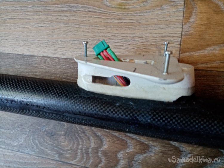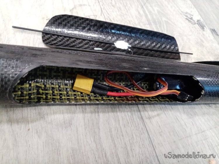 Вырезаю в носовой части фюзеляжа люк силового отсека. Устанавливаю оборудование. Крышка отсека фиксируется сдвигом при помощи карбонового прутика.