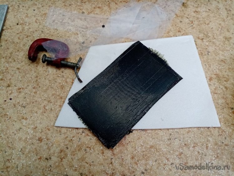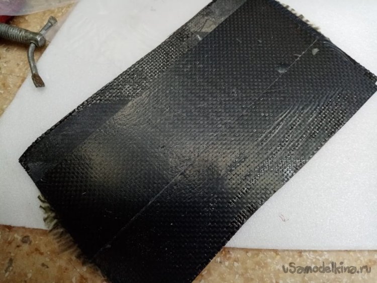 Часть первая изготовить из обрезков карбона пластину для качалки управления рулем высоты. Зажимаю пропитанную эпоксидной смолой карбонину между пластинами. Через сутки получается пластина карбона толщиной 0,8 мм.