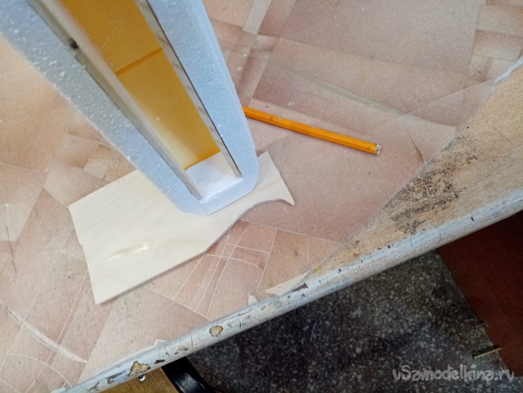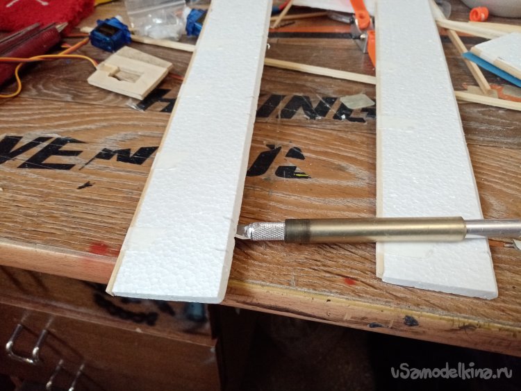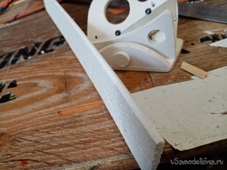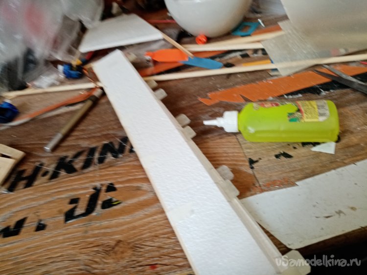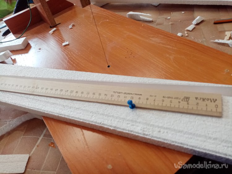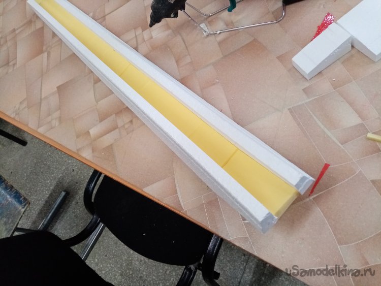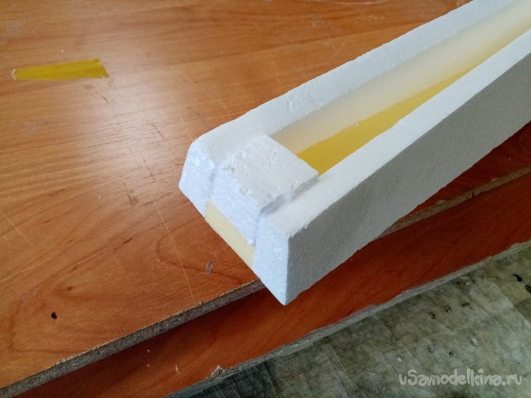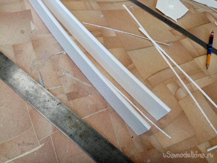 Фюзеляж также изготовил из обрезков пенопласта оставшийся от предыдущих проектов. Стараюсь максимально экономить материал и получать хорошее изделие из остатков. Из полоски утеплителя разрезанного по плоскости отрезаю полоску на днище фюзеляжа.