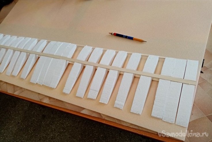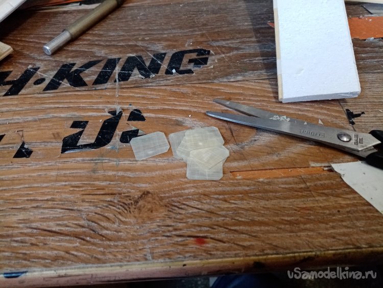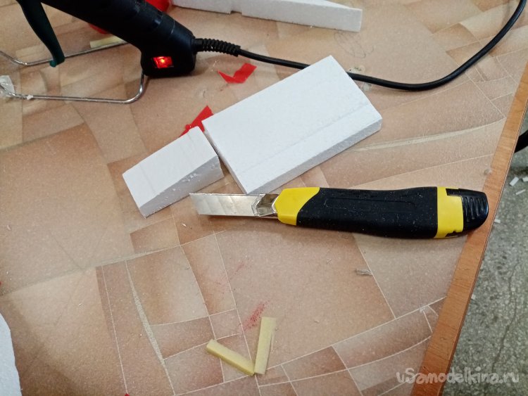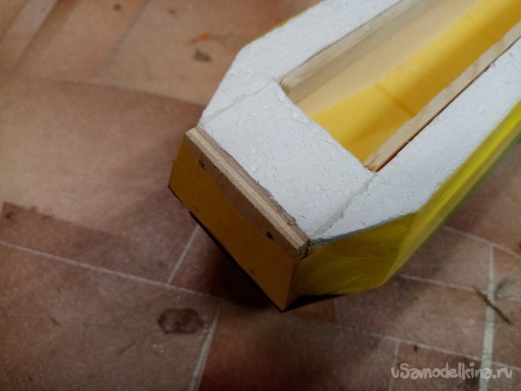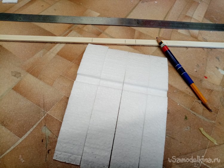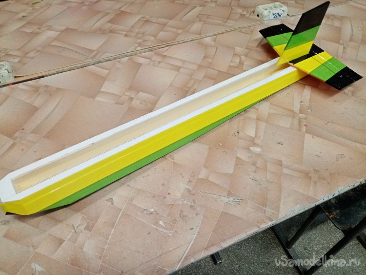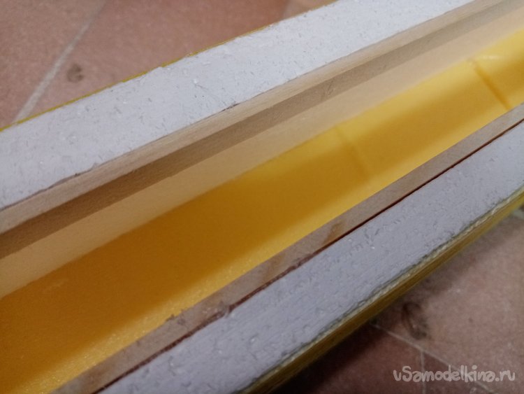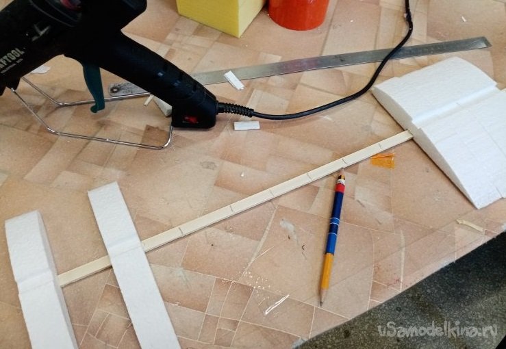 Фюзеляж также изготовил из обрезков пенопласта оставшийся от предыдущих проектов. Стараюсь максимально экономить материал и получать хорошее изделие из остатков. Из полоски утеплителя разрезанного по плоскости отрезаю полоску на днище фюзеляжа.