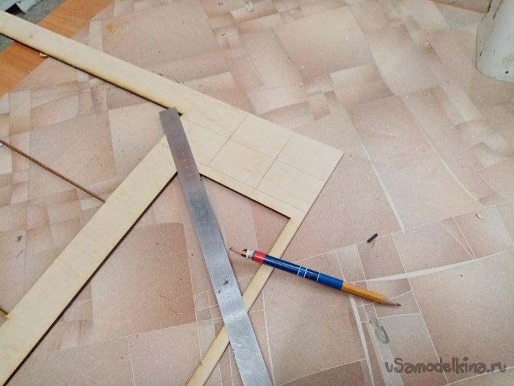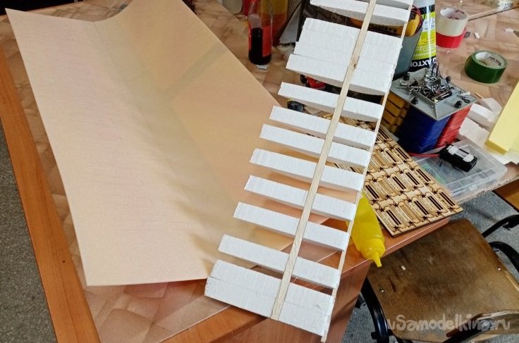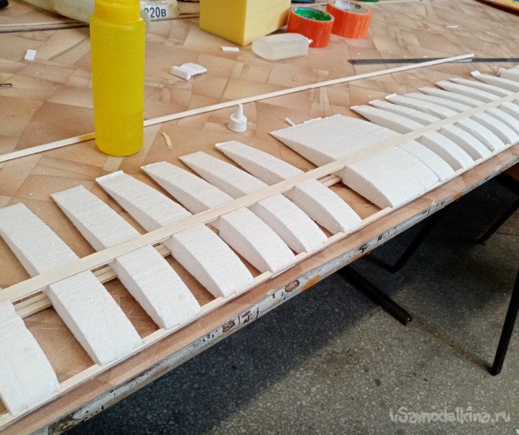 На нижнем лонжероне размечаю места установки нервюр. Они приклеиваются на титан, можно на термопистолет. Соединение имеет примерно одинаковую прочность. Сначала закрепляю набор нервюр на нижнем лонжероне, затем устанавливаю верхний и приклеиваю переднюю рейку.
