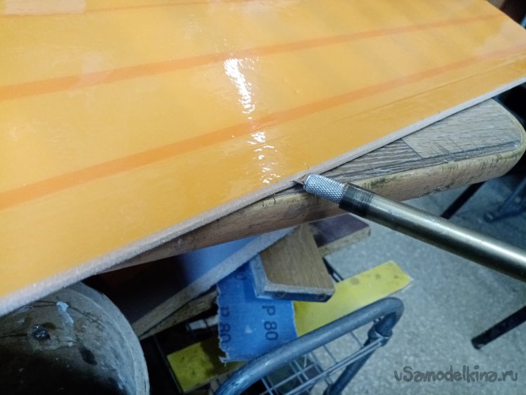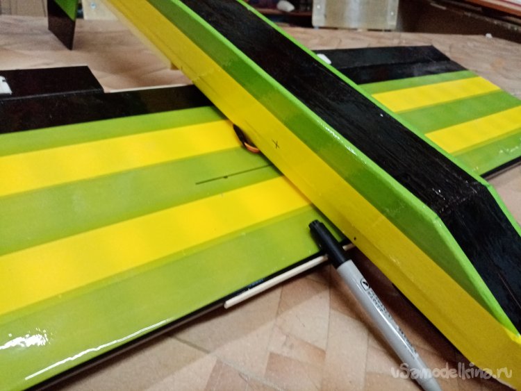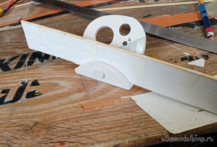 Крыло подсохло. Треугольным ножом для творчества прорезаю пазы под петли и вклеиваю элероны на титан.