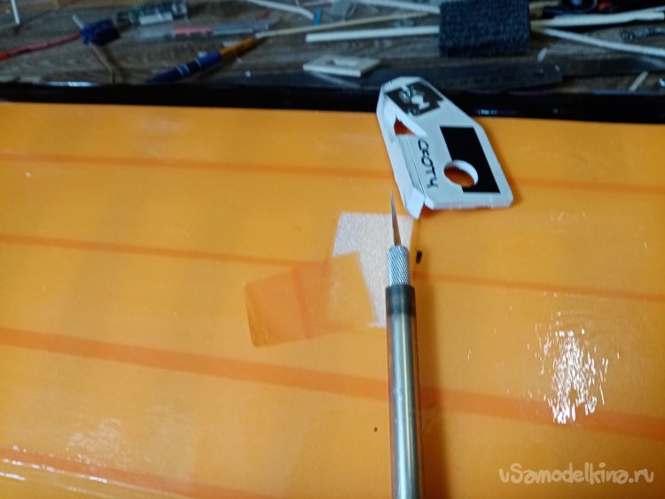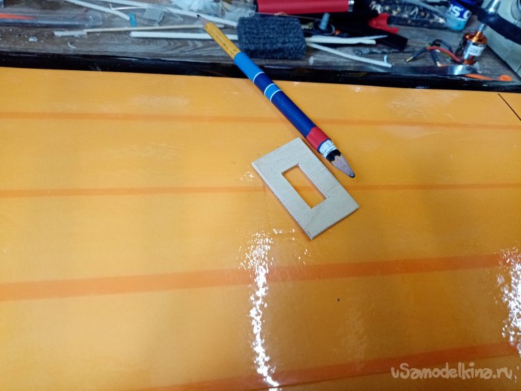 Для такой деликатной процедуры изготовил самодельный резак из пластика и бритвенного лезвия. Которое выглядывает из основания на микрон или больше. Позволяет разрезать только скотч, практически не повреждая пенопласт. Срезаю скотч, приклеиваю рамку и треугольным ножом прорезаю отверстие для установки сервопривода. В этом варианте провод управления проложу по верхней обшивке крыла. Меньше вероятность повреждения при грубой посадке.