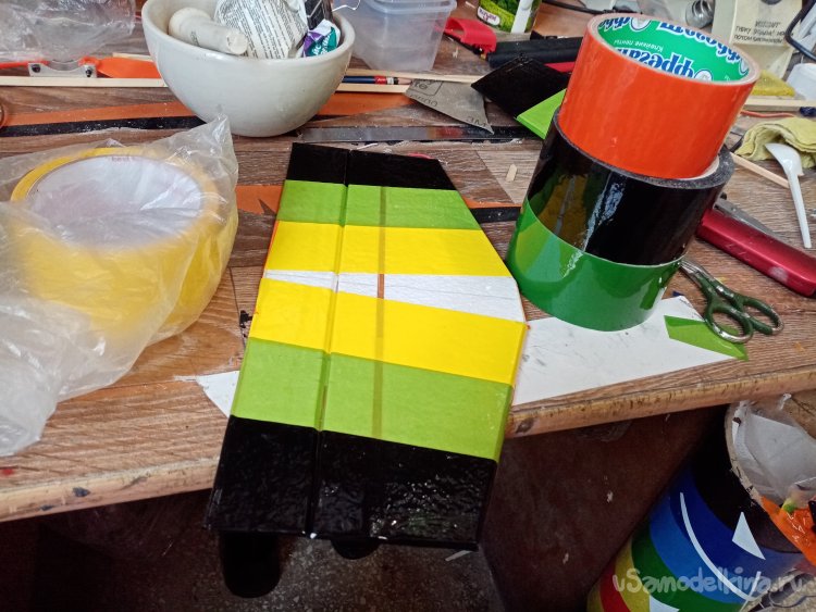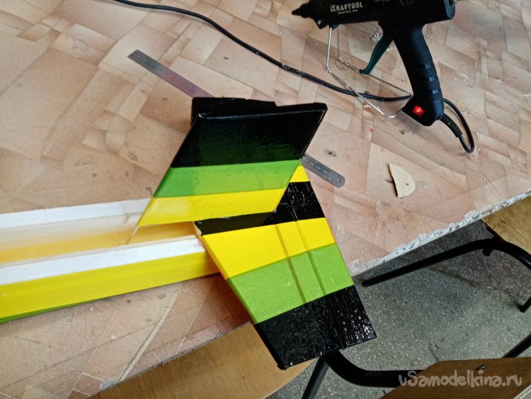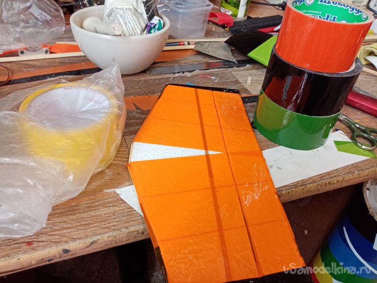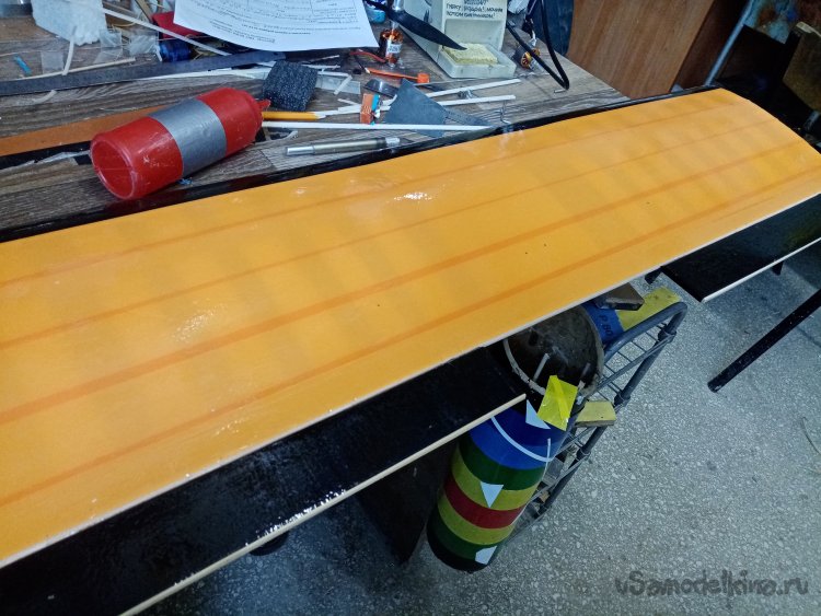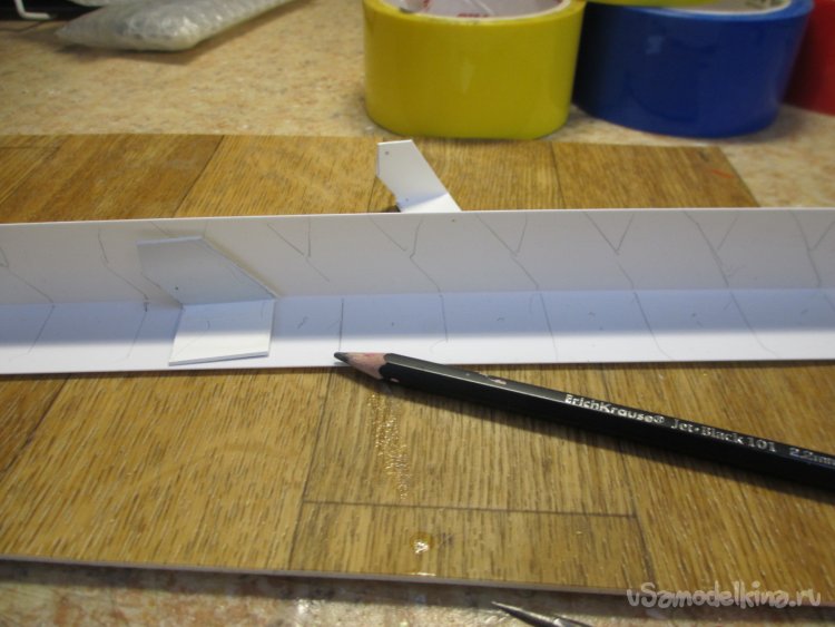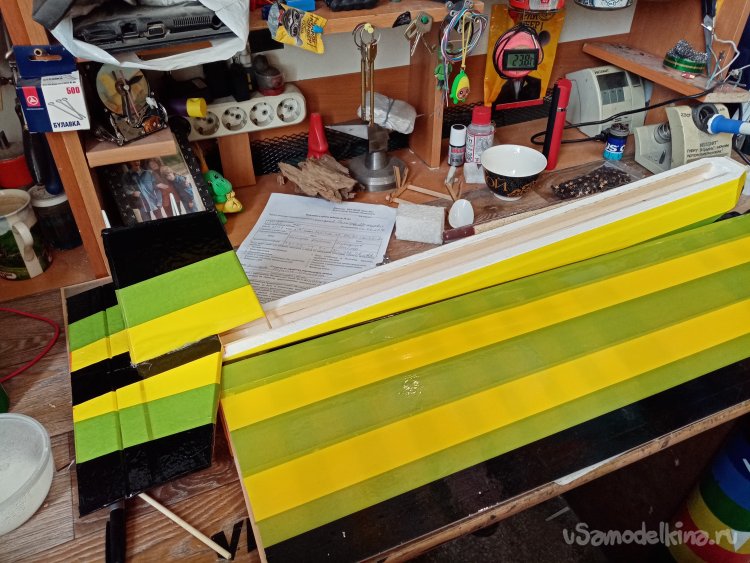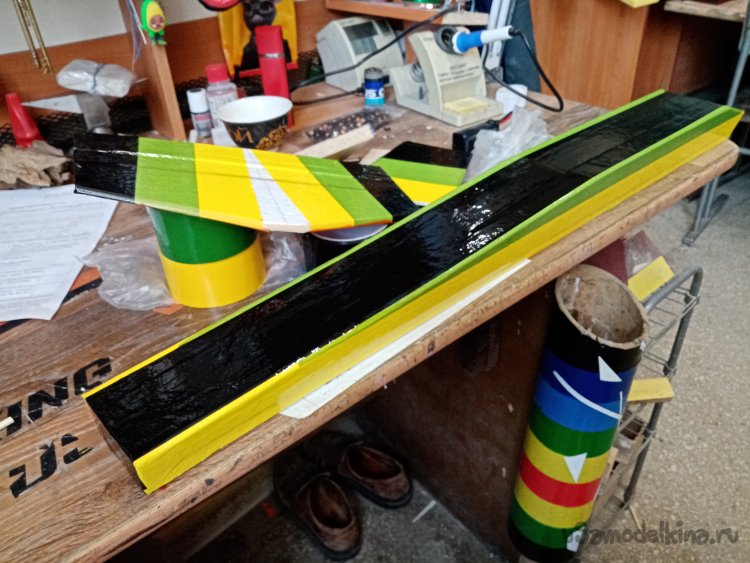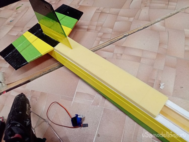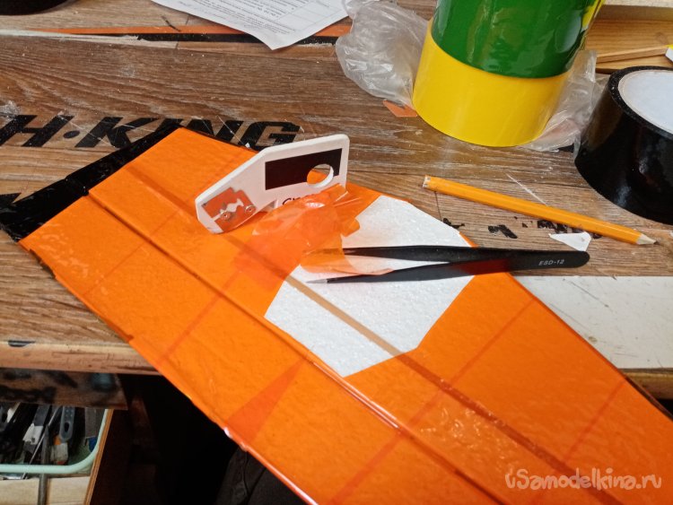Из обрезков вырезаю руль высоты, подвижную часть навешиваю на пластиковые петли. В заднюю и переднюю кромку приклеиваю рейки усиления. Также изготовил прочный руль направления. К бою готовлюсь однако. После приклейки усилений можно декорировать цветным скотчем. Перед оклейкой прошелся по всем плоскостям шкуркой и затем удалил опилки влажной тряпочкой, оклейку делаю по кругу. Поскольку скотч отлично прилипает сам к себе и посредственно к пенопласту. Для гарантии еще проглаживаю картинки утюгом. Приваривая к пенопласту скотч. Верх и низ оклеиваю контрастными цветами. Для лучшего опознавания модели в куче-мале боя. Места приклеивания элементов освобождаю от скотча.