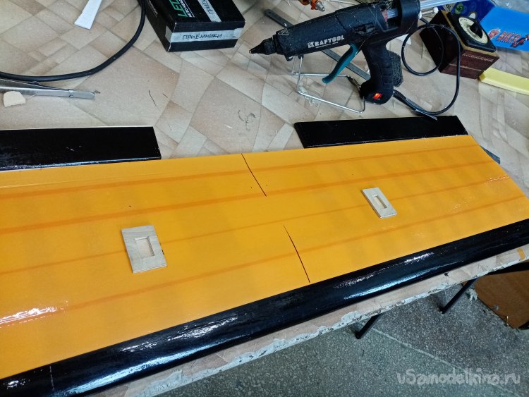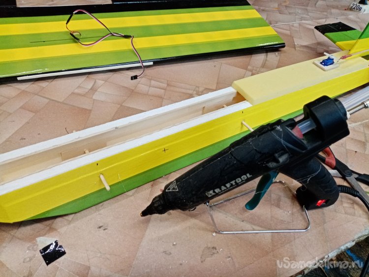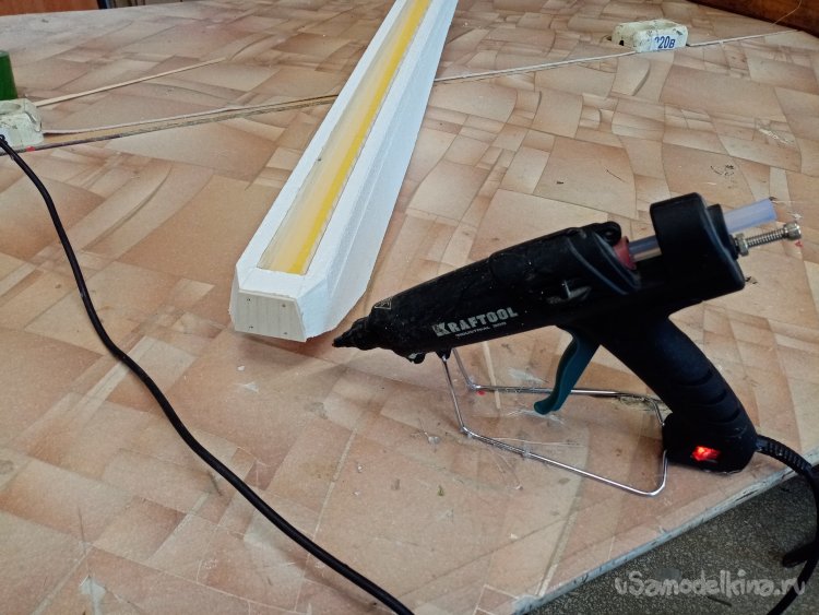 Склеиваю борта и днище при помощи термопистолета. В носовой части приклеиваю усиление моторамы.
