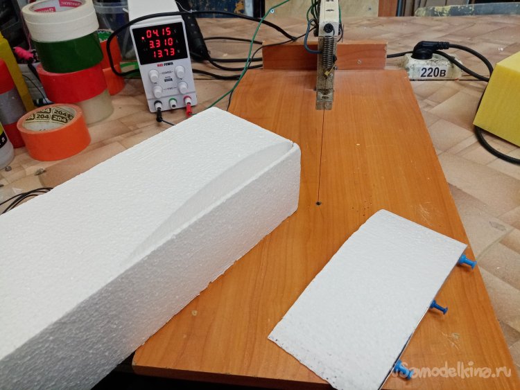По алюминиевым шаблонам вырезаю заготовки нервюр. Можно использовать для этого различные обрезки пенопласта. Мне попался толстый кусок, осторожно вырезаю нервюру. После разрежу её на блоее тонкие заготовки. Для работы мне понадобился самодельный вертикальный станок с нихромовой струной.