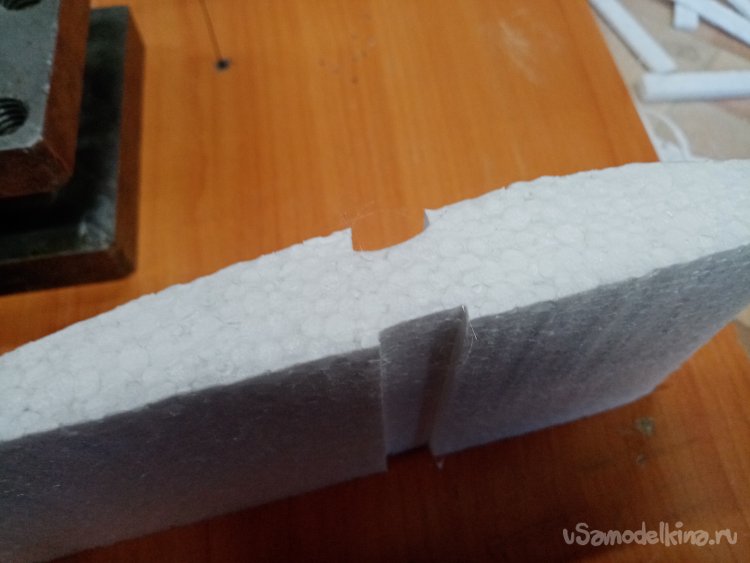 Пока крыло сохнет, продолжаю. Нужно изготовить элероны. Нашел в запасе много обрезков пенопласта от предыдущих проектов. Подбираю нужный размер по длине и сечению. Отрезаю нужную заготовку. Кромку прилегания к крылу нужно срезать под углом в 45 градусов с двух сторон. Есть парочка способов осуществить эту операцию. Просто срезаю ножом по линейке. Но ребята м эта операция затруднительна. Изготовил резак из пластика и обломка канцелярского ножа. Устанавливаю заготовку элерона вертикально и прорезаю угол.