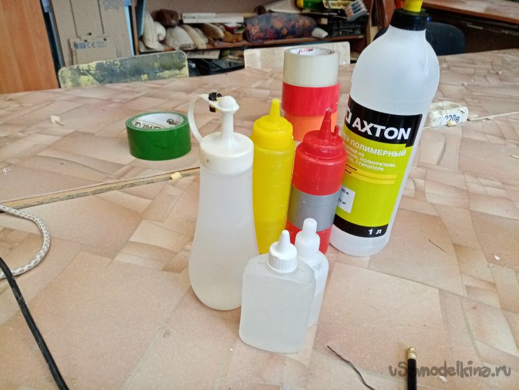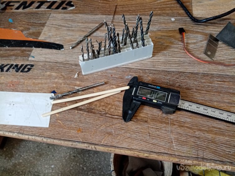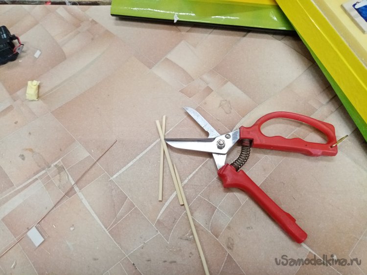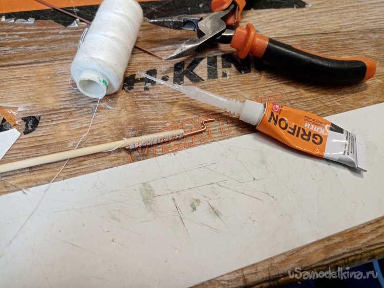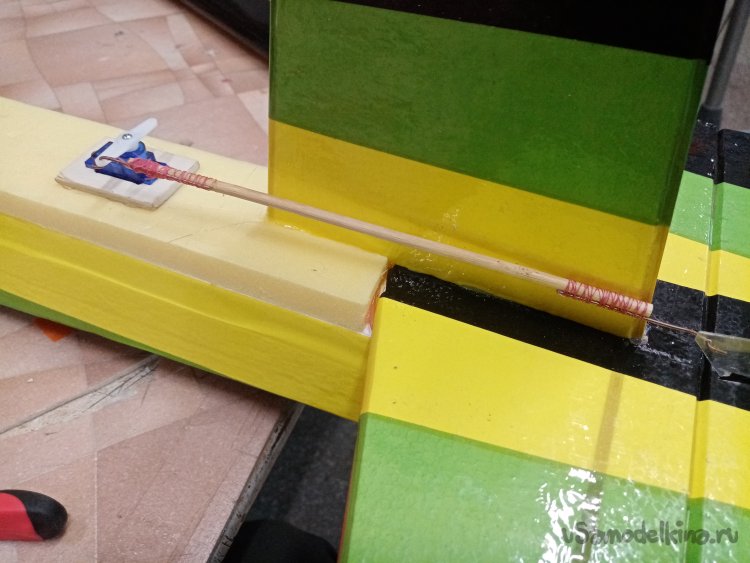На руль высоты тяги делаю из бамбуковых шпажек с кончиками из проволоки. От сервопривода до подвижной части руля высоты расстояние большое, есть риск прогиба проволочной тяги. Кончик из проволоки приматываю нитками и проклеиваю циакрином.