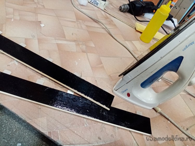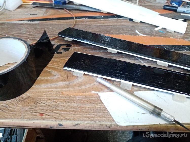 Оклеиваю нервюры скотчем для прочности проглаживаю утюгом. От нагрева он хорошо приваривается к пенопласту. Затем вклеиваю пластиковые петли.