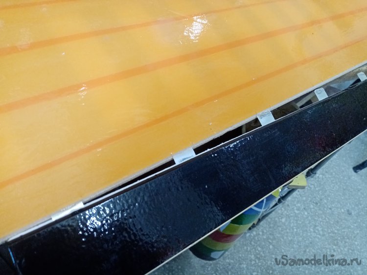 Затем наношу клей по разметке на внутреннюю часть обшивки и на нижнюю нервюр. Выжидаю минут пять, для загустевания клея и осторожно размещаю набор на место.