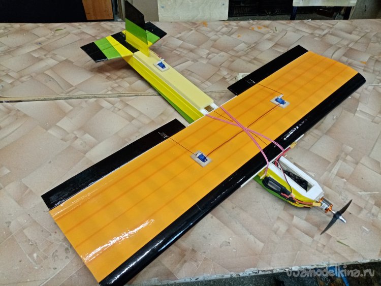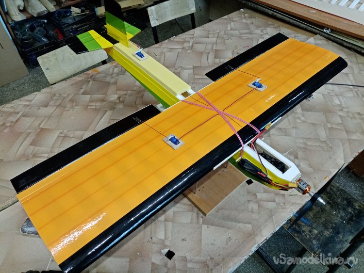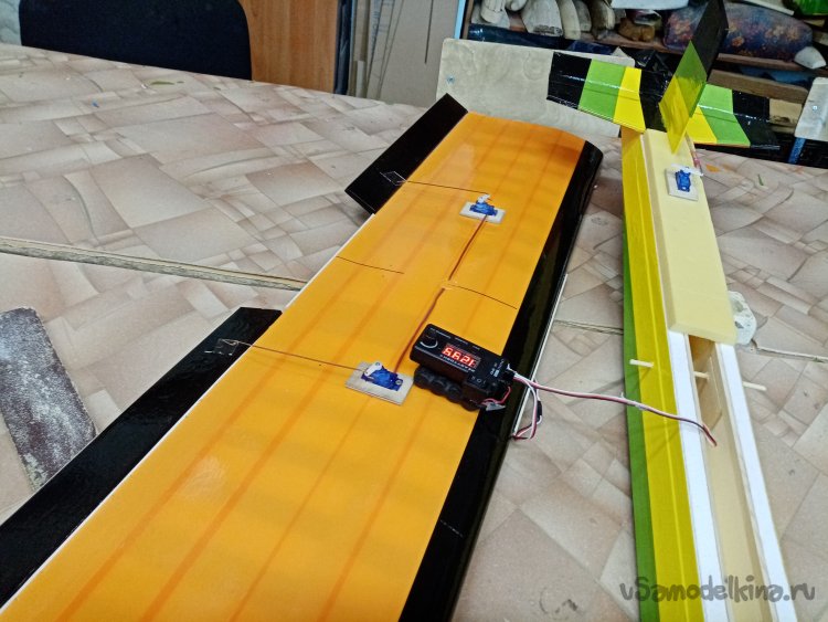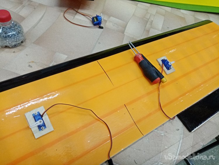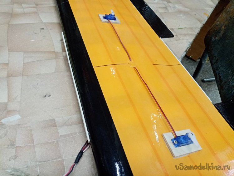 На элероны устанавливаю кабанчики, провожу управления от сервоприводов. Проверяю работоспособность системы.