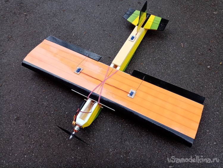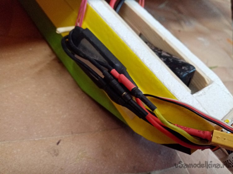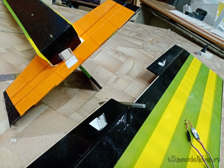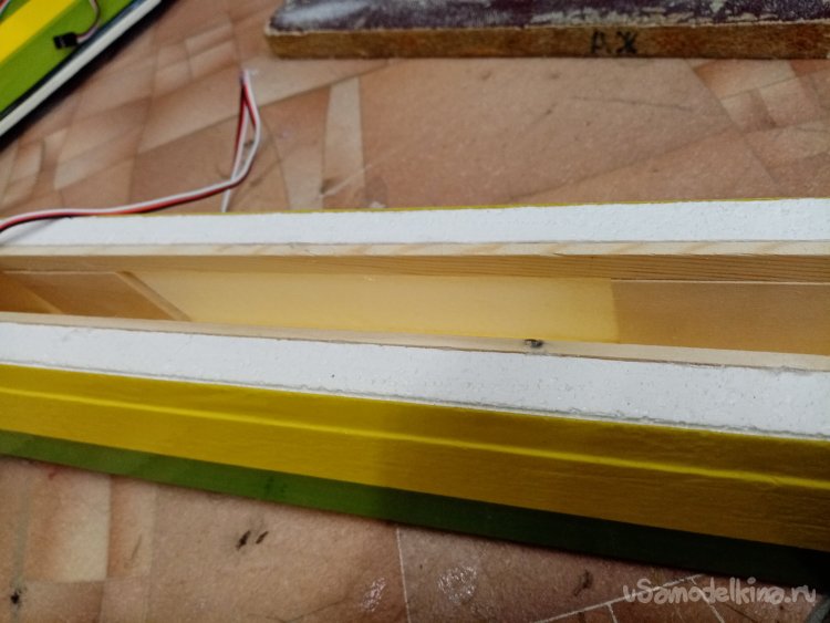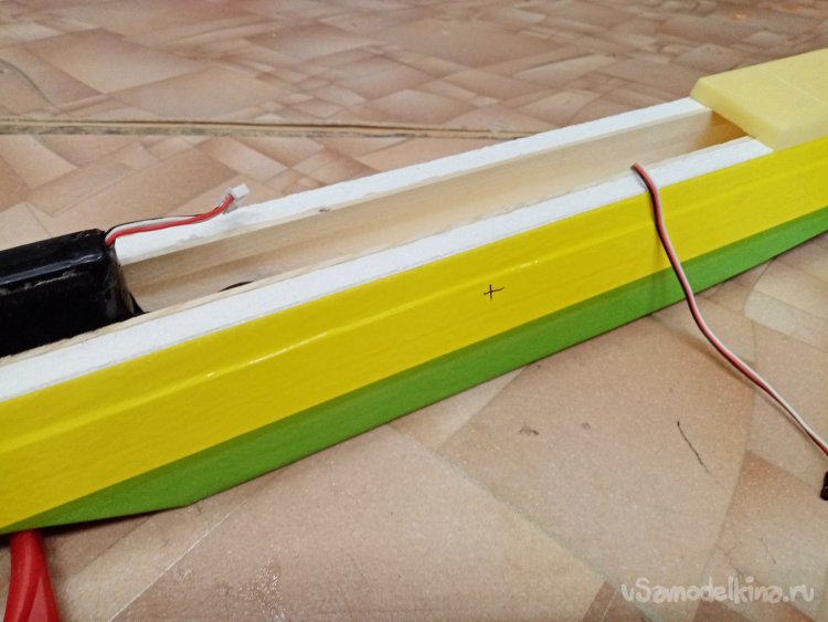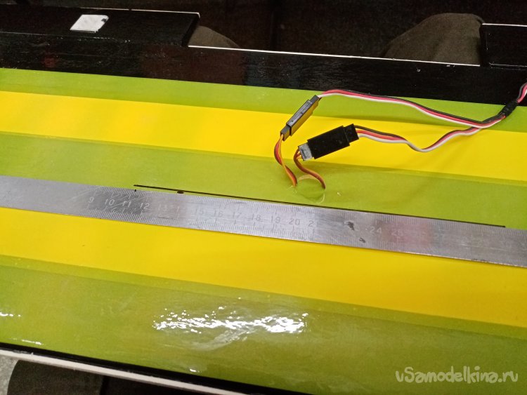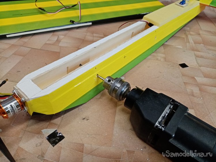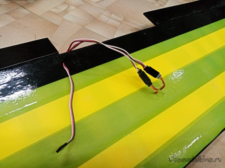 Заточенной трубочкой выпиливаю сквозное отверстие в крыле и перевожу провода на нижнюю плоскость. Сервоприводы можно соединить через разветвитесь, или как вариант, замикшировать во второй и пятый канал управления.