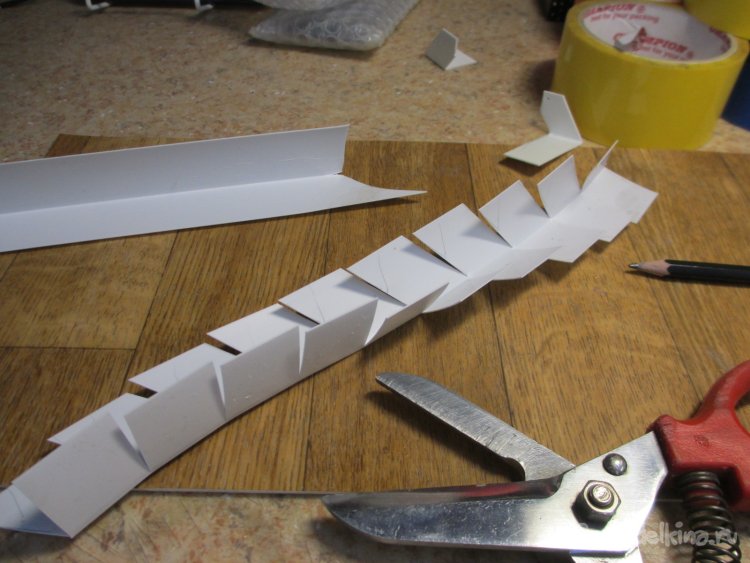 Для обшивки размечаю подложку, укладываю на нее набор крыла и обвожу карандашом места прилегания нервюр. Это нужно для нанесения клея. Чтобы обшивка не треснула при изгибе, в носовой части есть два метода. На среднюю часть в районе сгиба наклеиваю с внешней стороны три полосы скотча. Такая процедура укрепляет пенопласт и не дает лопаться при сгибе. Можно и полностью заклеить скотчем всю внешнюю сторону обшивки.
