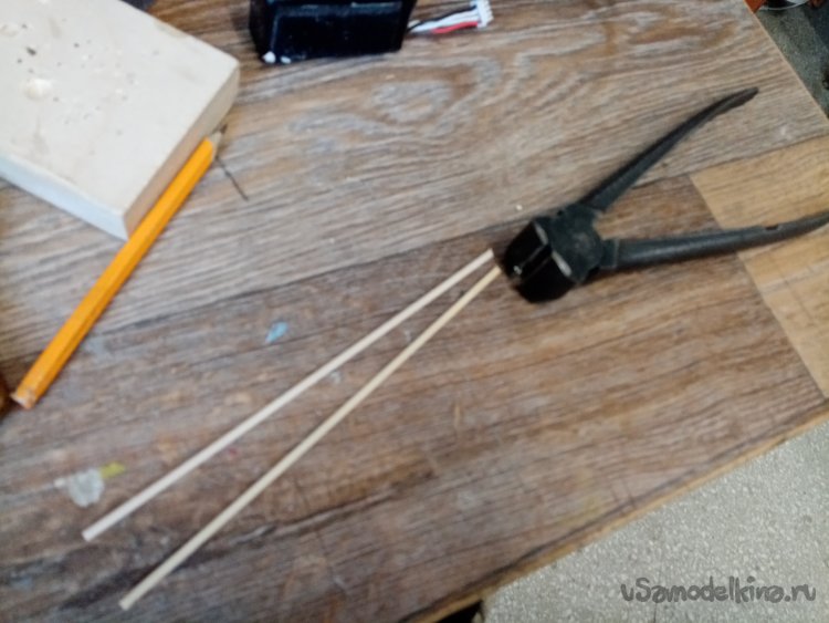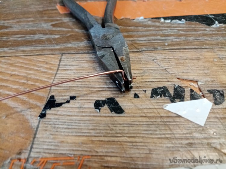 Тяги управления элеронами согнул из проволоки от сварочных автоматов диаметром в 1,2мм. Расстояние короткое и управление будет достаточно жесткое. Для сгибания кончиков тяг изготовил простое приспособление из старых плоскогубцев.