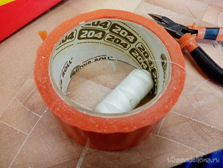 Совет в тему, чтобы моток ниток не бегал по столу в процессе, положил его в кружок скотча, можно в стакан.