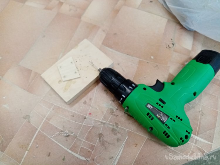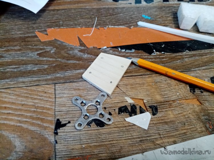 Из фанеры, по разметке выпиливаю накладку на усиление моторамы. Предварительно размечаю отверстия под шурупы крепления двигателя и сверлю отверстия. Поскольку на готовом корпусе делать это затруднительно.