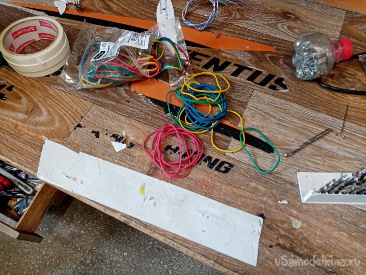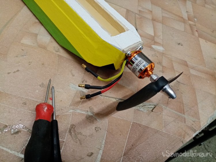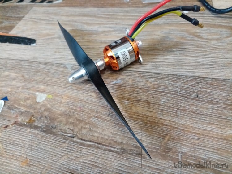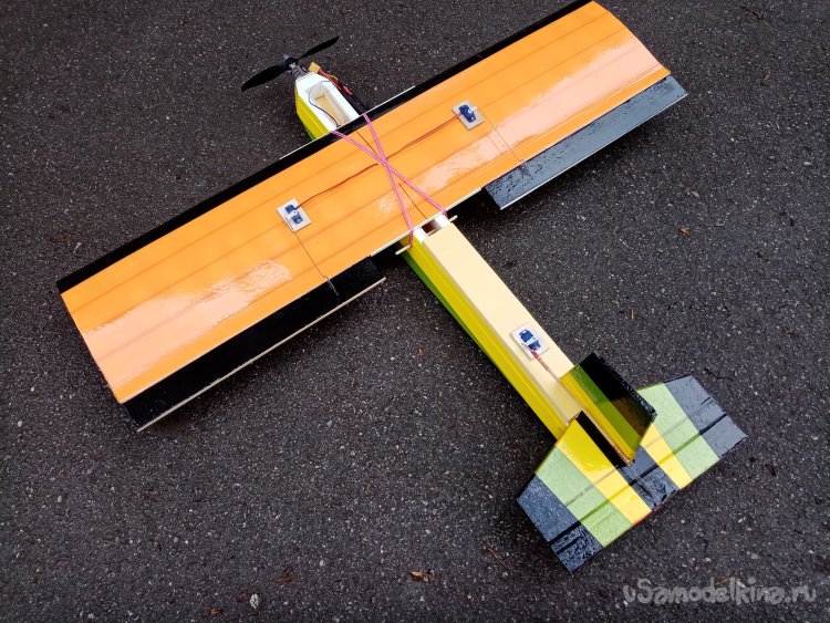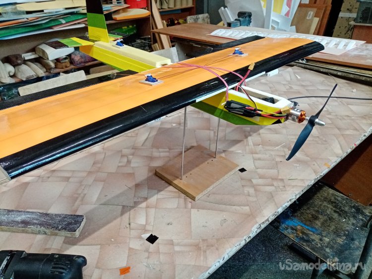 Нужно определить центр тяжести фюзеляжа. Методом инженерного тыка. Для этой сложной процедуре устанавливаю на фюзеляж все оборудование. Сервопривод на руль высоты. Мотор с винтом, регулятор, аккумулятор. Мне нужно размещение основных масс в объеме фюзеляжа. После установки частей, определяю цент тяжести оснащенного фюзеляжа. Размечаю положение крыла. В местах установки штырей крепления резинок с внутренней стороны приклеиваю квадратики фанеры. Через них сверлю отверстия и вставляю бамбуковые палочки. За палочки при помощи резинок будет крепиться крыло. Как вариант страховки при грубой посадке, резинки не позволят ему сломаться.