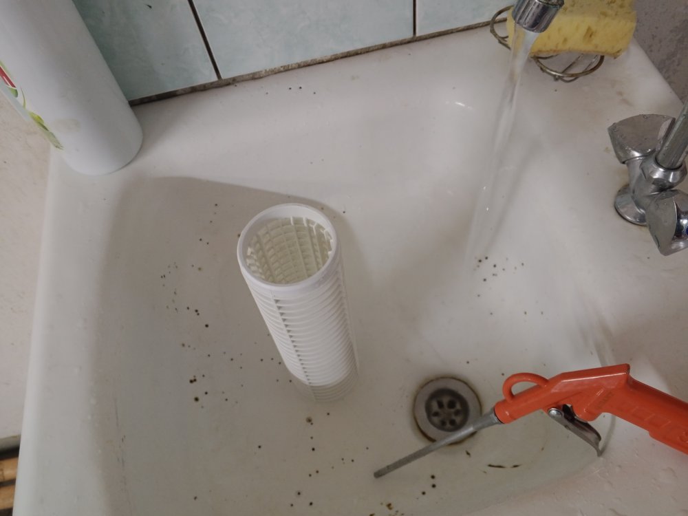 Угловой штуцер и витой рукав длинной 3 метра, были основой «пылесоса». Тестирование системы показало неплохой результат. Угловой штуцер присасывался в отверстие «форсунки» очень хорошо и 25-й рукав, предварительно полностью затопленный под воду, чтобы не образовалось воздушных полостей, засасывал донный мусор «на ура». Отстыковка штуцера от системы происходила, только после отключения насоса, и он свободно вынимался из «форсунки». Рукав засасывает мусор хорошо, но и присасывается ко дну и стенкам тоже не плохо. Под рукой оказался носик от лейки с плоским выходом. Кольцо из камеры от велика, как уплотнитель, а на него носик от лейки и вот уже что-то вырисовывается похожее на «пылесос». Полипропиленовая армированная труба и две припаянные к ней заглушки, сформировали ручку – держатель. Белая изолента закрепила конструкцию воедино. Испытания показали, что носик от лейки не работает, даже со срезанным одним краем, от давления слипаются стенки и вода с мусором не проходят в узкую щель, а срезать выше, смысла нет, очень узкий носик получается.