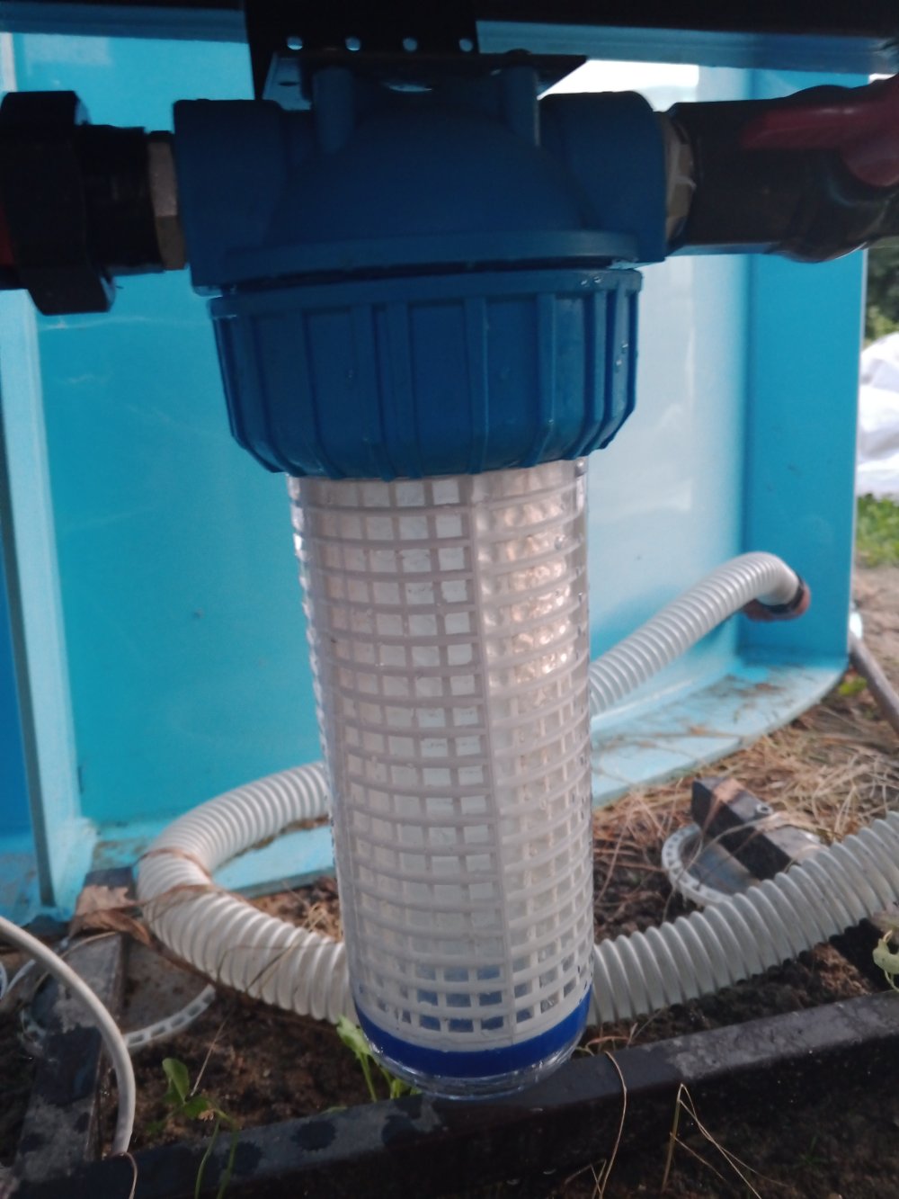 Насосно – фильтрационный узел разместил в «задней» части бассейна, чтобы был не на виду. Определил места нахождения «форсунок», высверлил коронкой, на 32, отверстия в бортах чаши, закрутил проходной фитинг со штуцерами. Добавил перед фильтром запорный кран для того, чтобы перекрывать магистраль в месте подачи воды, при обслуживании фильтрующего элемента. Верхняя «форсунка» (сейчас), отсекается поворотом углового штуцера наверх, а некоторое время затыкалась просто пробкой от бутылки из-под шампанского. Подсоединил рукава, залил воду, подключил электричество, и вот процесс циркуляции воды «пошел». Напор хороший. Насос будет работать постоянно, весь сезон. Изначально возникла небольшая проблемка, так как верхняя «форсунка» расположилась высоковато (нужно было засверлиться пониже), вода, разливаясь под напором по поверхности, создавала сильное журчание, в тишине особенно хорошо слышно. Ощущение того, что где-то прорвало магистральную трубу. Проблемка по устранению журчания, разрешилась в магазине сантехники. Оказалось, что внутренняя часть проходного узла почти Ф25 мм. и угловой штуцер на 25 мм., с намотанной чуть изолентой, идеально подходит по размеру и дополнительно выполняет функцию направления потока.