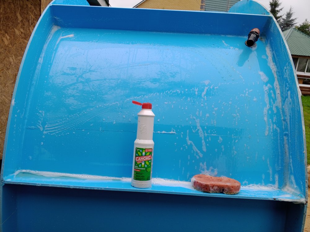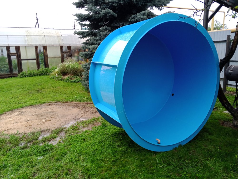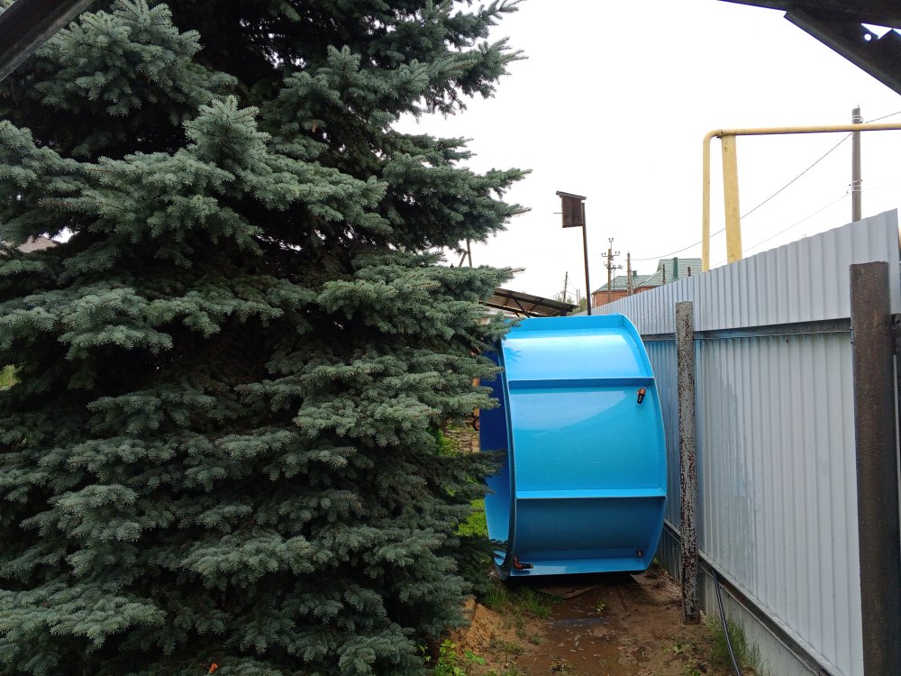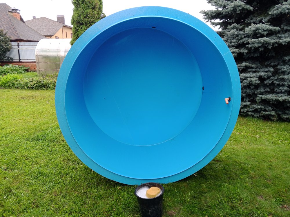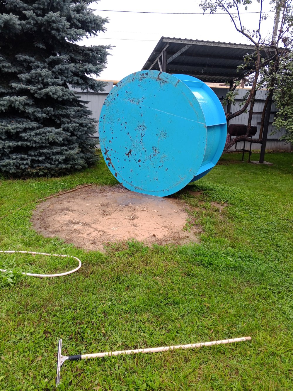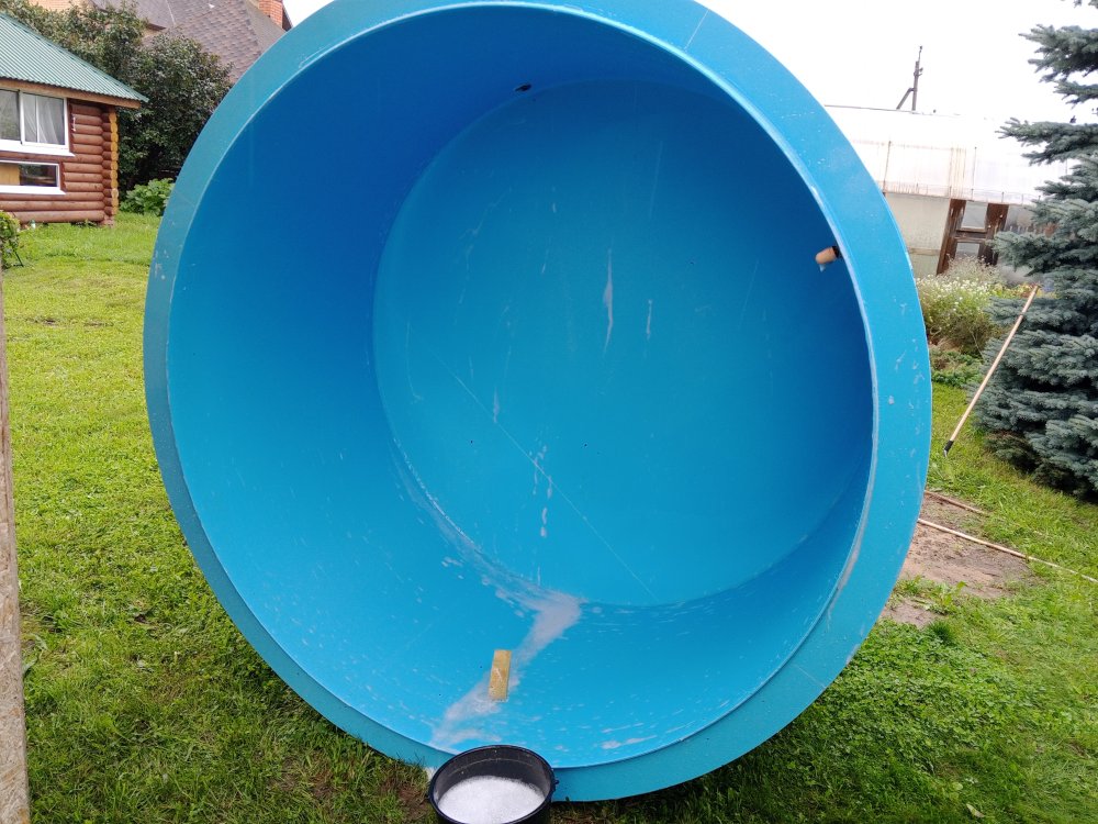 В межсезонье, по удобным мне размер - цене, у местного производителя, заказал сварную из полипропилена чашу. Поплескаться после баньки, да и просто искупаться вполне хватит. Объем воды получился поменьше чем в надувном, около 2800 литров (Ф2000х900), против 3800 литров (Ф3000х550). Расчеты примерные, все зависит от уровня воды. Чаша была доставлена на участок и установлена на «старое» для басика место. Подсыпал песочка для выравнивания основы грунта. К новому бассейну подключил, заранее сделанное, новое оборудование.